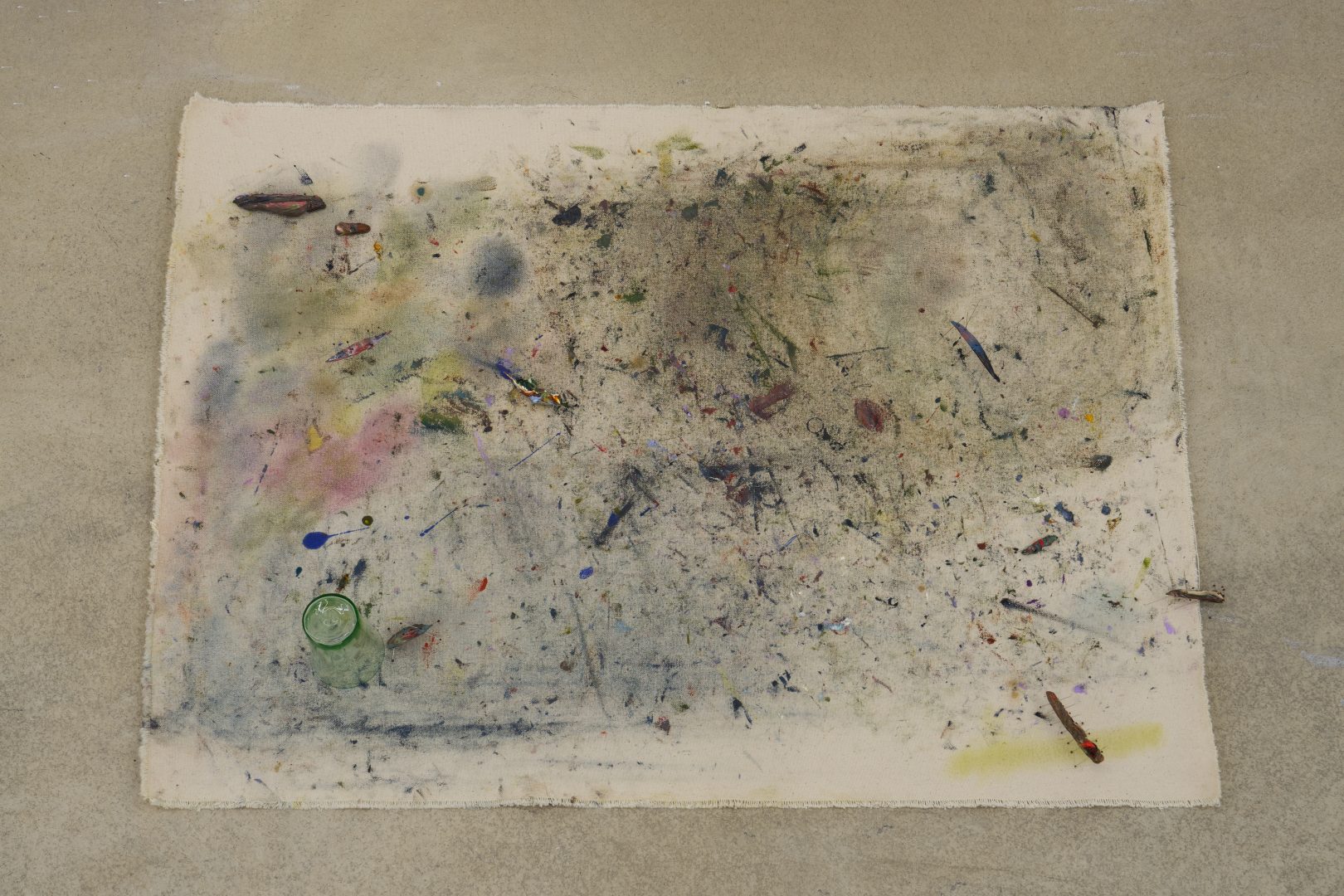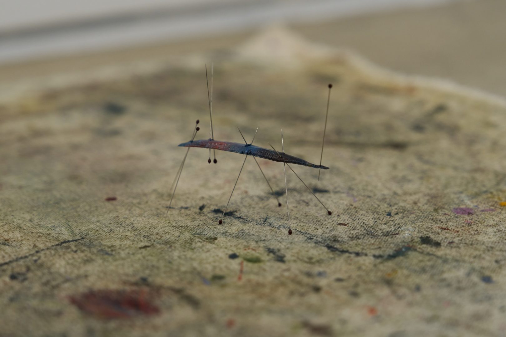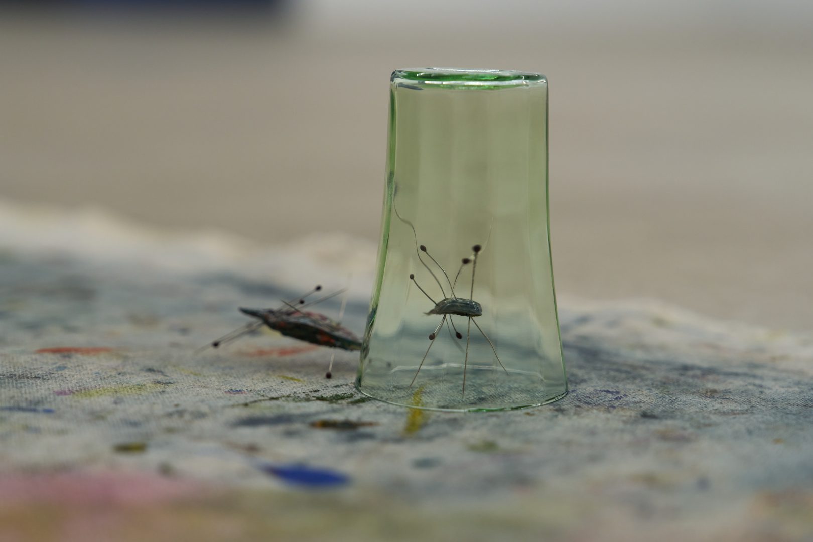 Oil, canvas, stainless steel insect pins, uranium glass cup