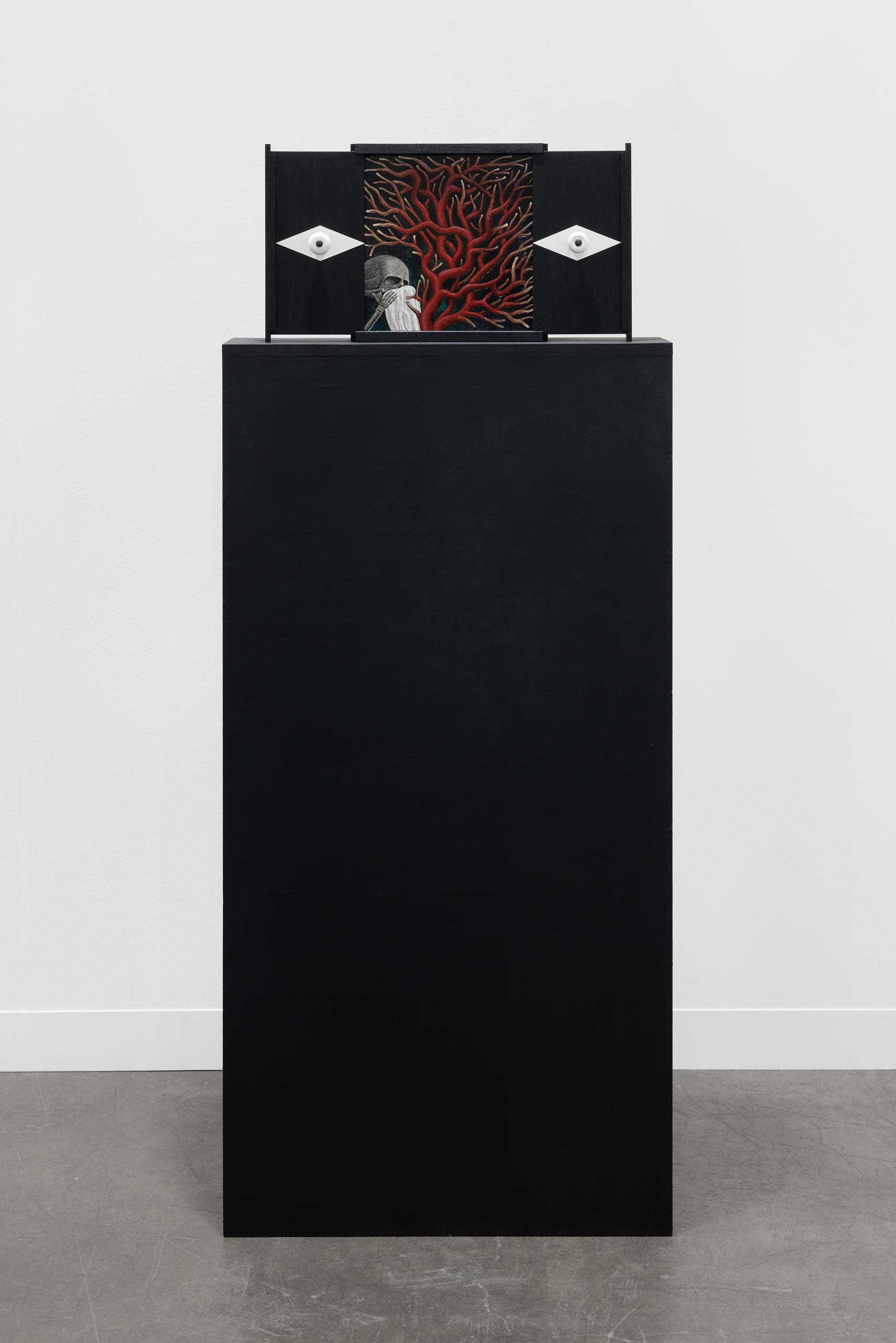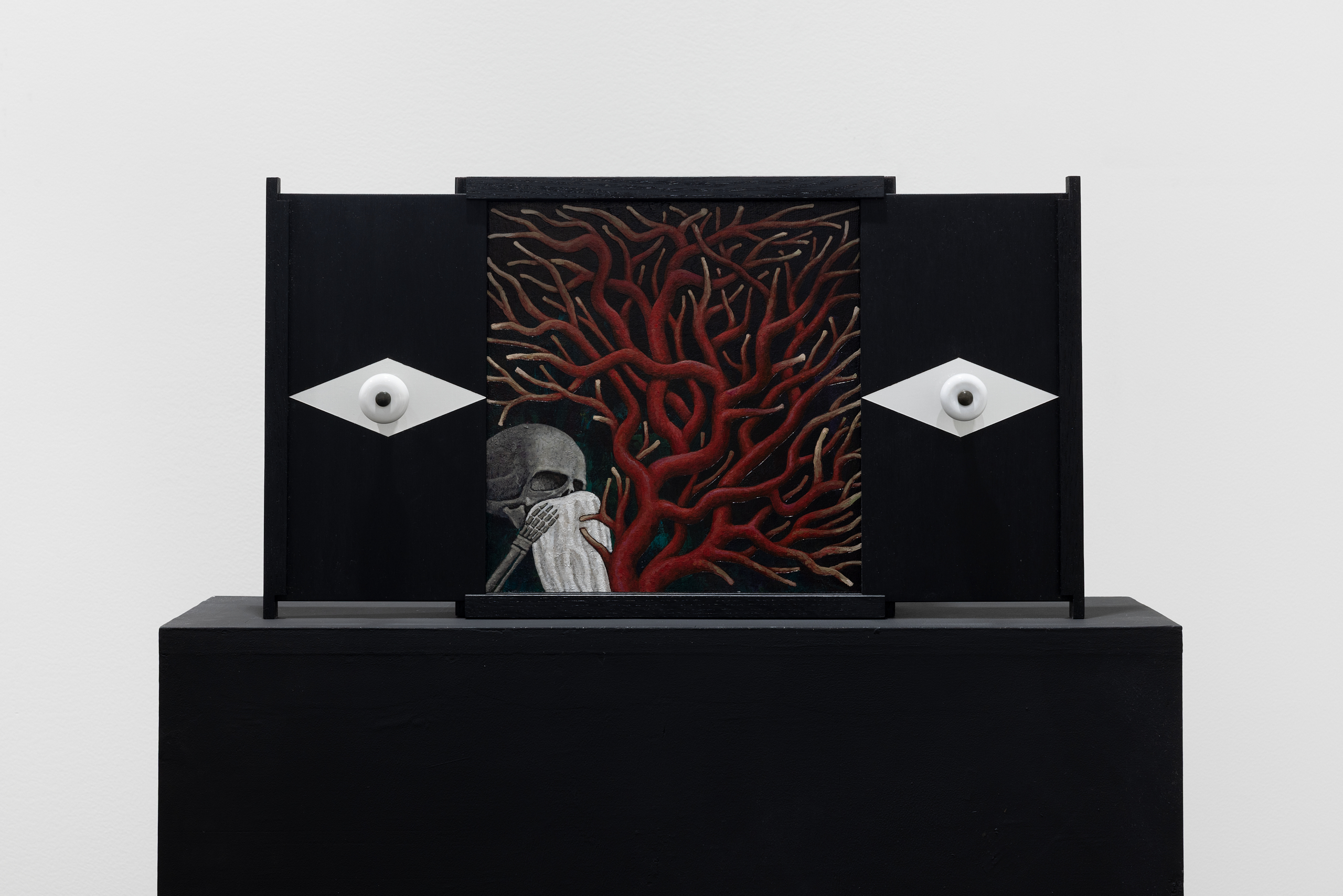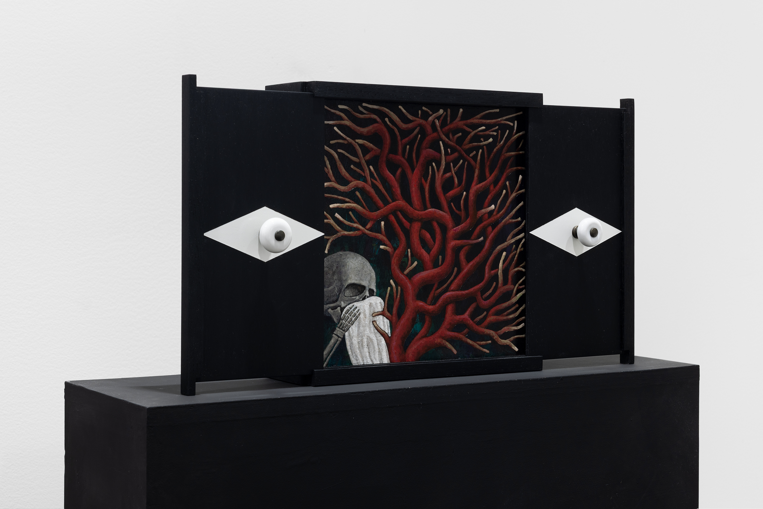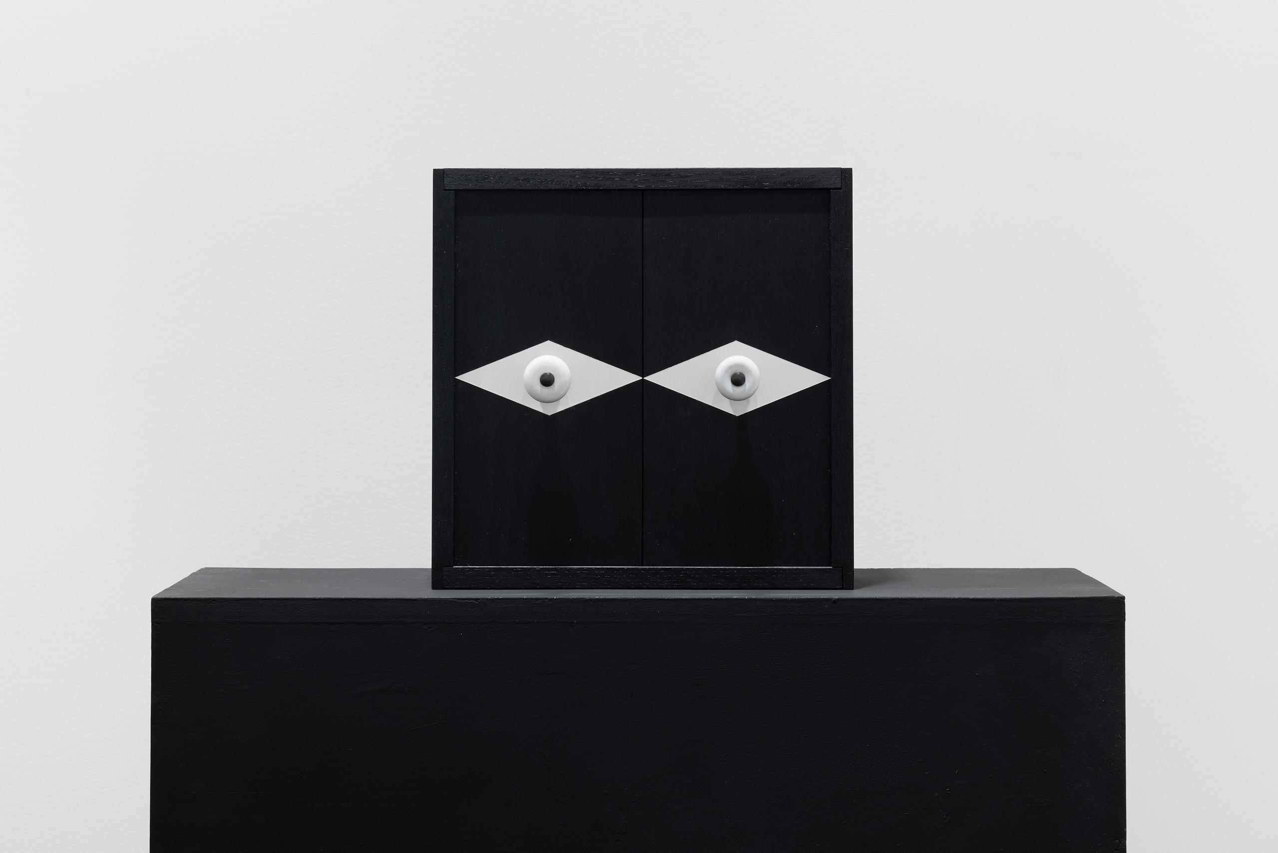Acrylic and varnish on gessoed linen mounted on Hdf, stained painted oak, brass knob