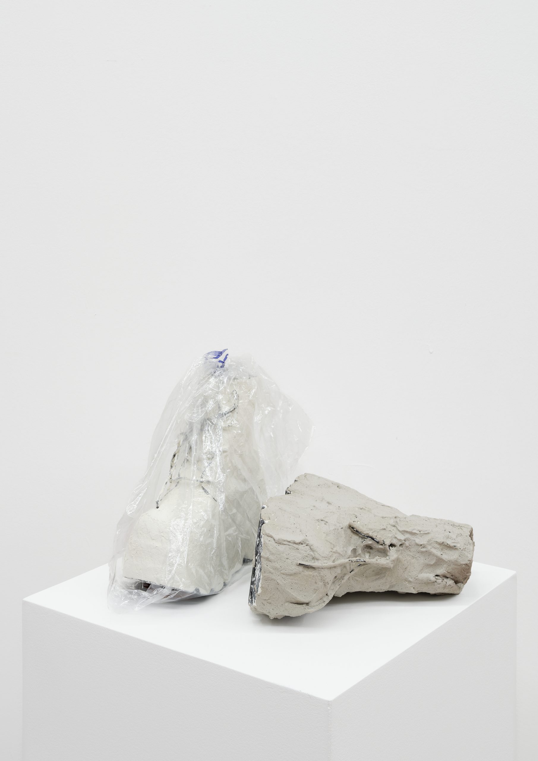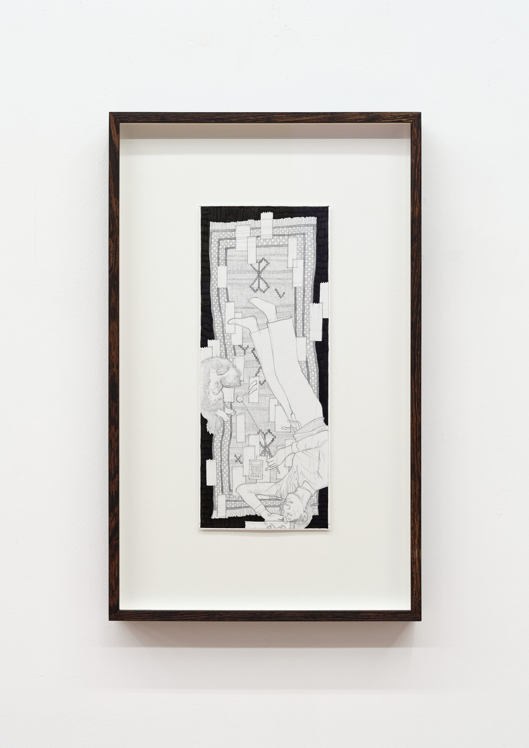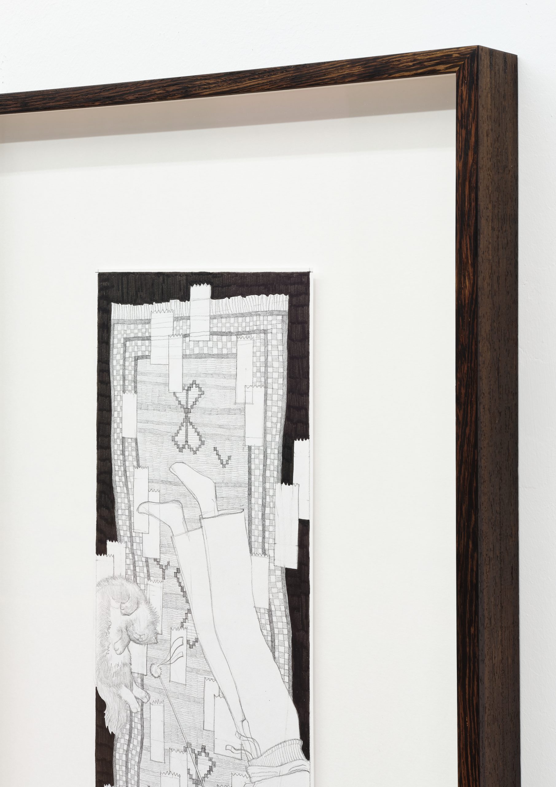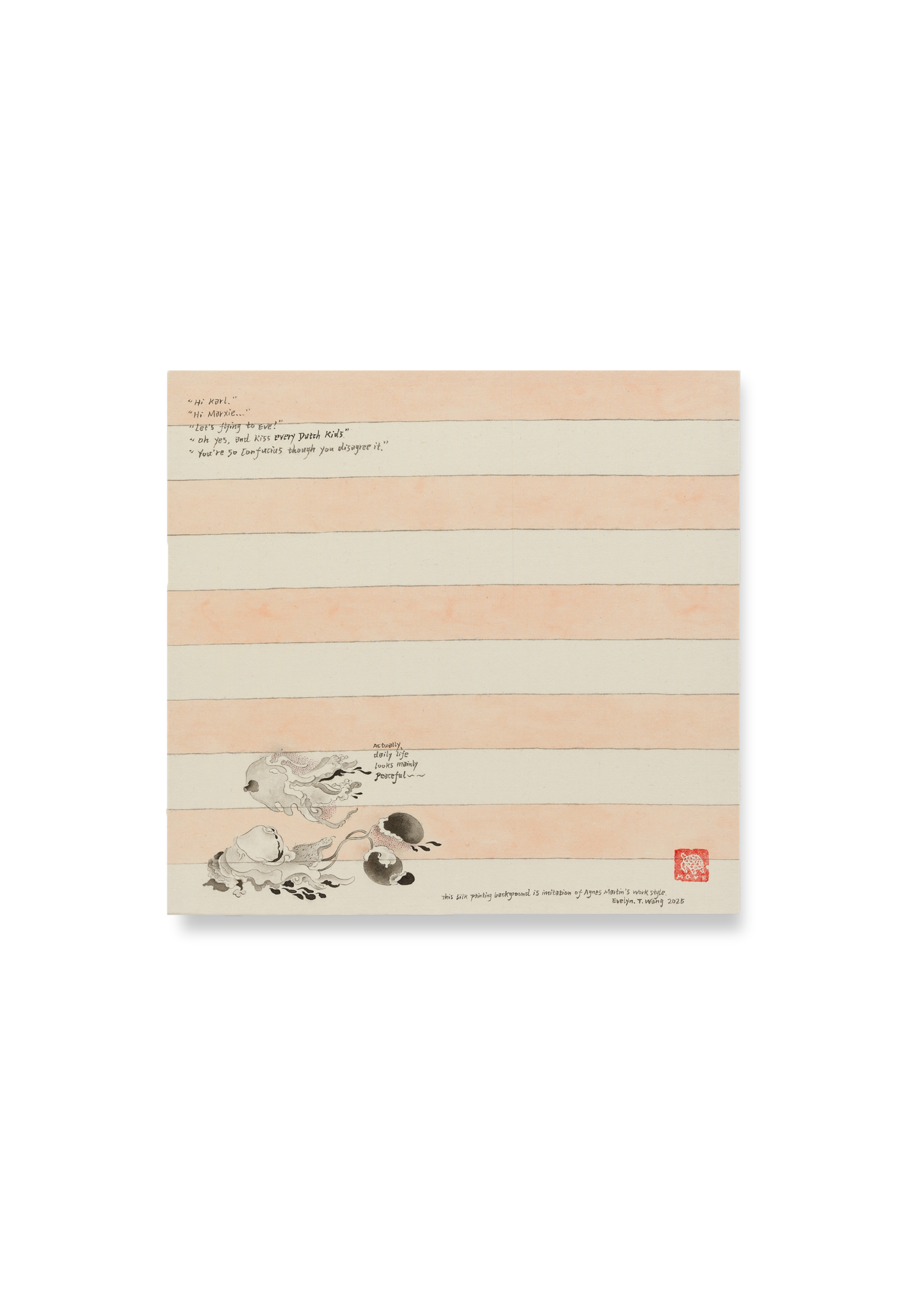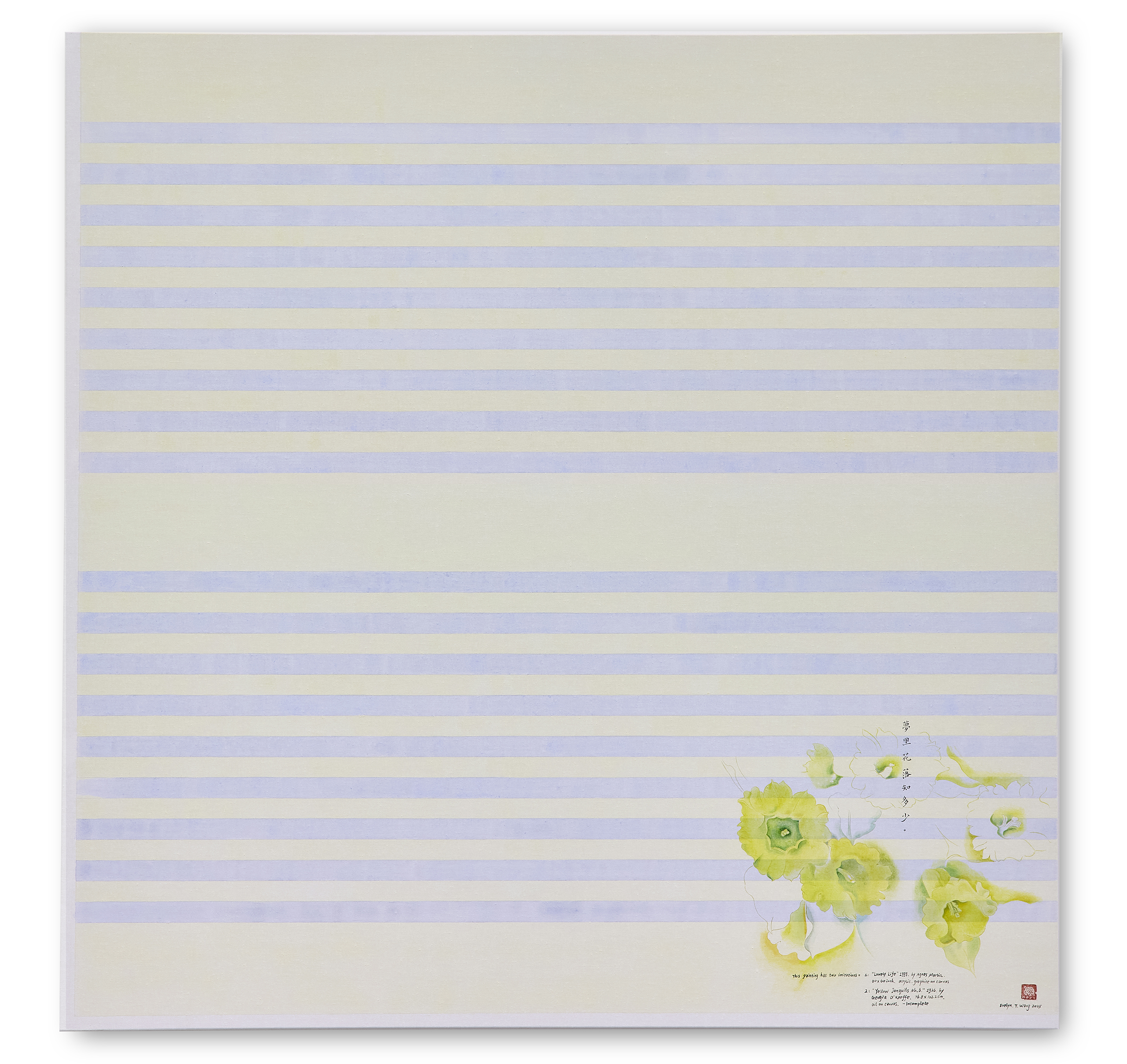 Among the works presented, Shuang’s shoe sculptures Teenagers (2024) and These words change nothing (2023) revisit the tension between ‘bodily absence’ and ‘collective imagination’ within fan culture. Functioning as vessels for memory, the sculptures simultaneously reconstruct an illusory scene teeming with human figures. Evelyn Taocheng Wang’s two new pieces, ‘Copied Agnès Martin’, place historical figures, philosophical musings, and artistic and cultural symbols onto Agnès Martin’s signature striped framework like ready-mades. This creates a leaping yet intimate dialogue, allowing rigorous formal order and free-spirited musings to coexist in rich symbiosis. Li Yong Xiang’s works on paper revisit his classic paintings and sculptures, capturing the figure of a resting youth suspended between passivity and vigilance, restraint and unrestrained revelry. Cui Jie’s pieces, meanwhile, present a stark yet nostalgic allegory of modernity beneath the overlapping images of financial towers and animal ceramics from the reform era.