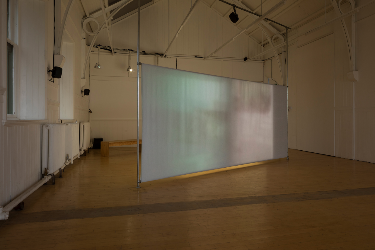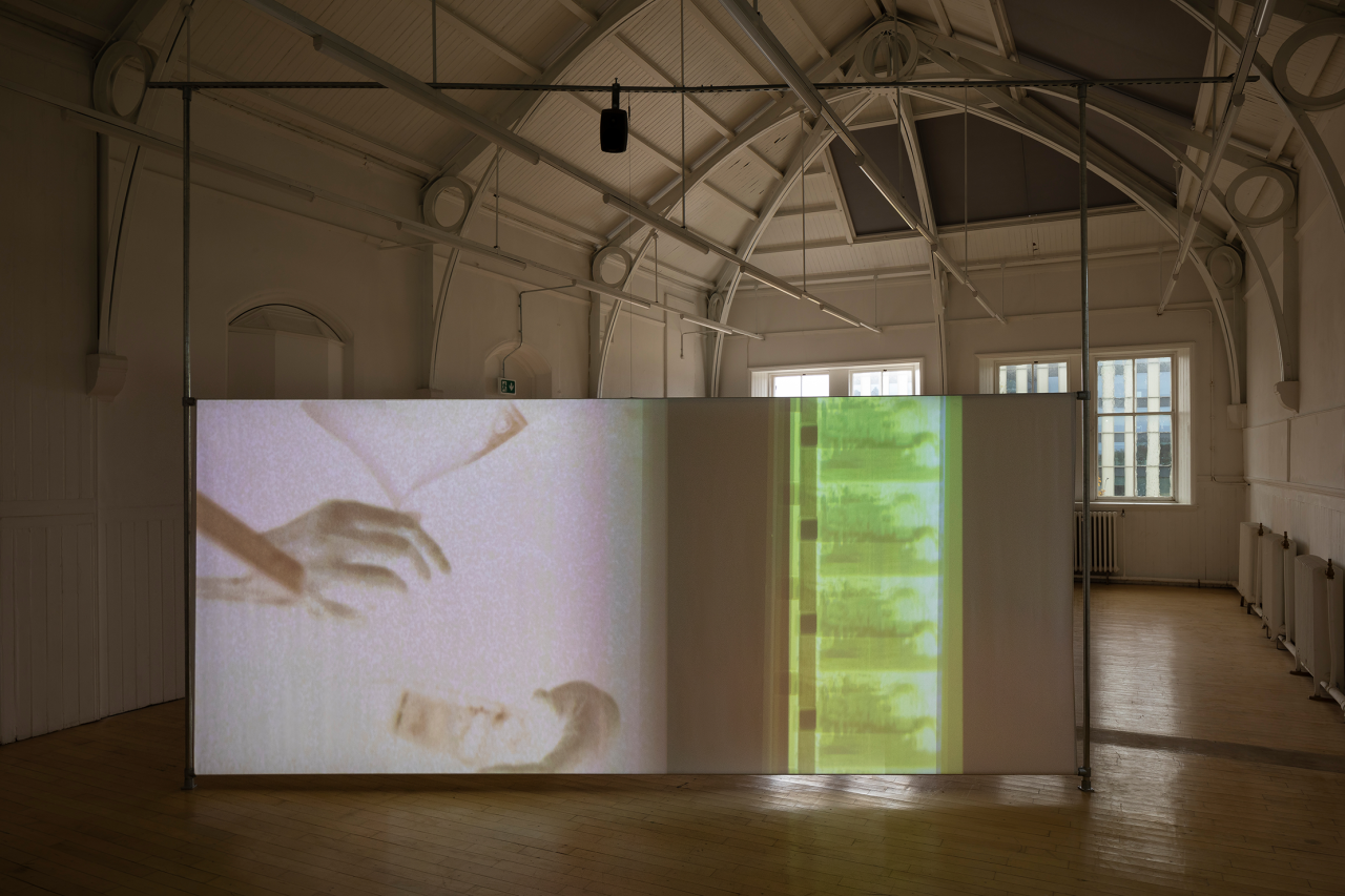 Cameraless filmmaking techniques and legacies of structural filmmaking are at the centre of ‘Afternoon Hearsay’. Archival 8.75mm prints are photogrammed onto 16mm and 35mm colour negative print stock and woven together with contemporary Super 8 footage shot by Peng. By doing so, Peng creates images of film strips that merge, burn, and tear through chromatic space. Interlayered and overlapping images coalesce with fragments of optical sound and narratives from unnamed interlocutors. The installation conjures an ambiguous and expansive temporal space in which the boundaries of fact and fiction are indistinguishable and immaterial, whilst the solidity of memory is foregrounded through the sensorial materiality of film.
