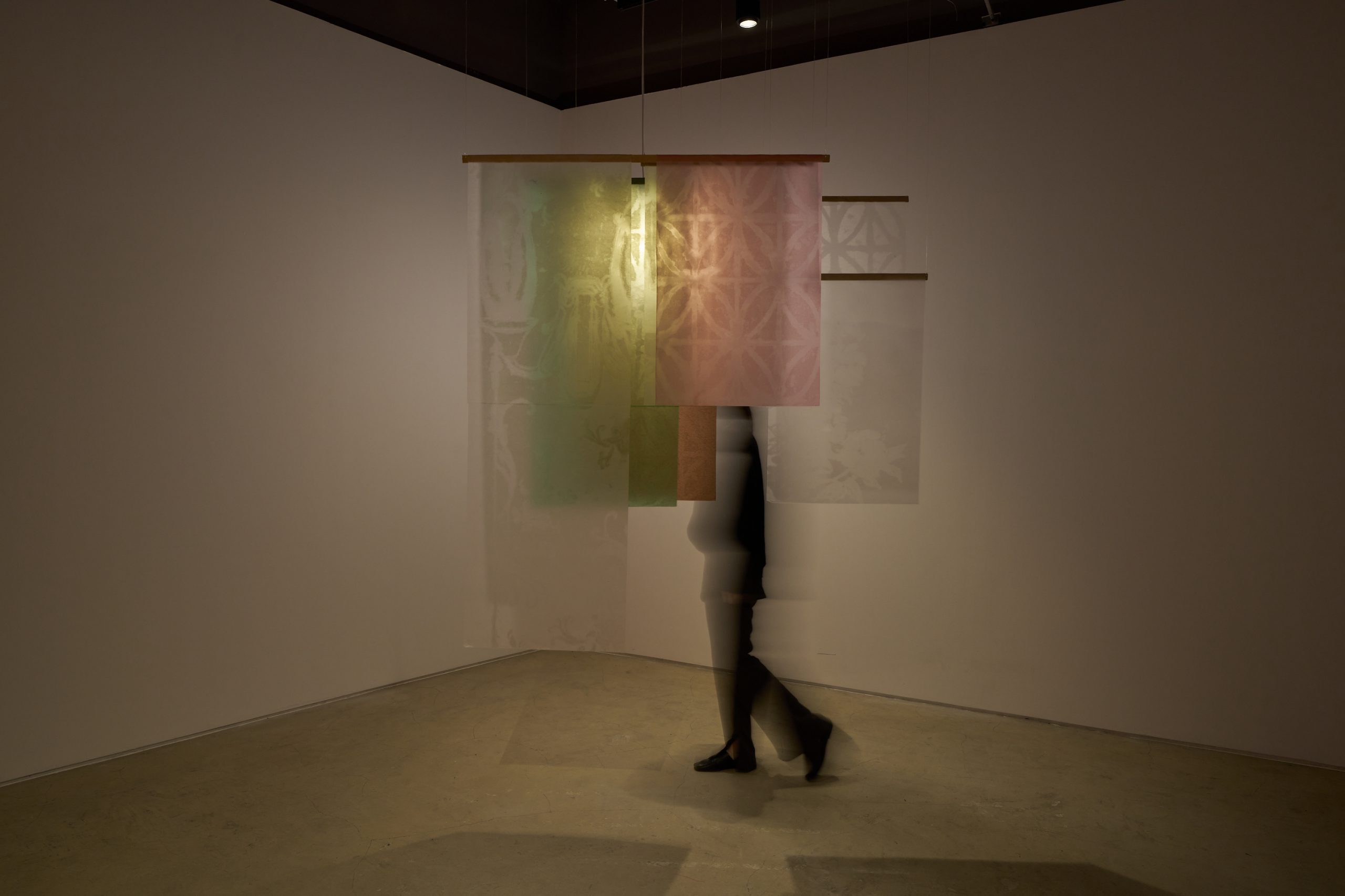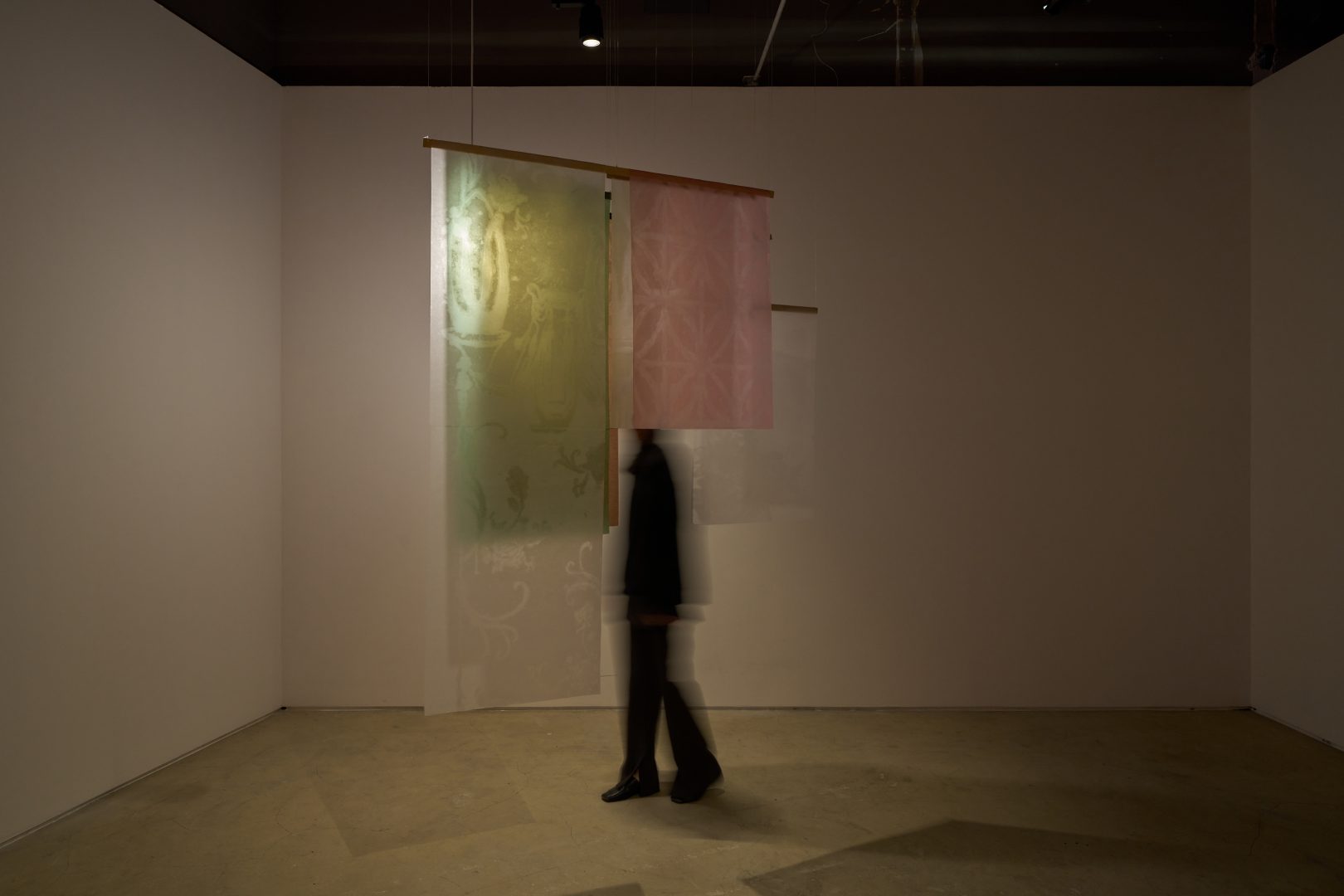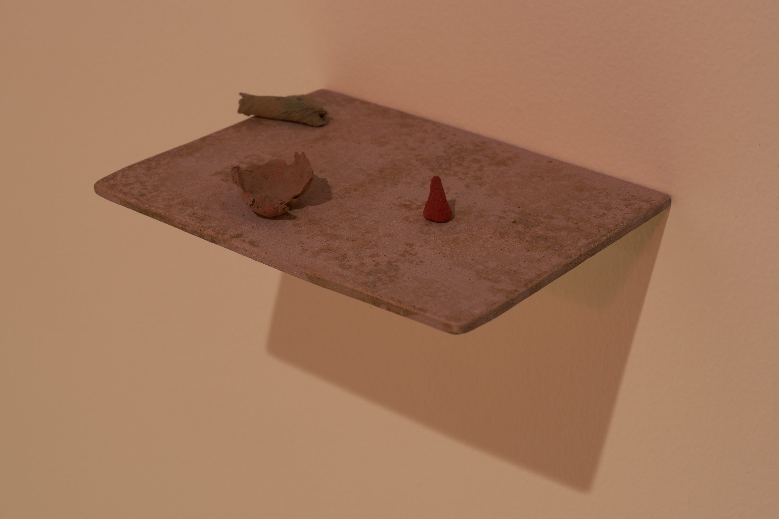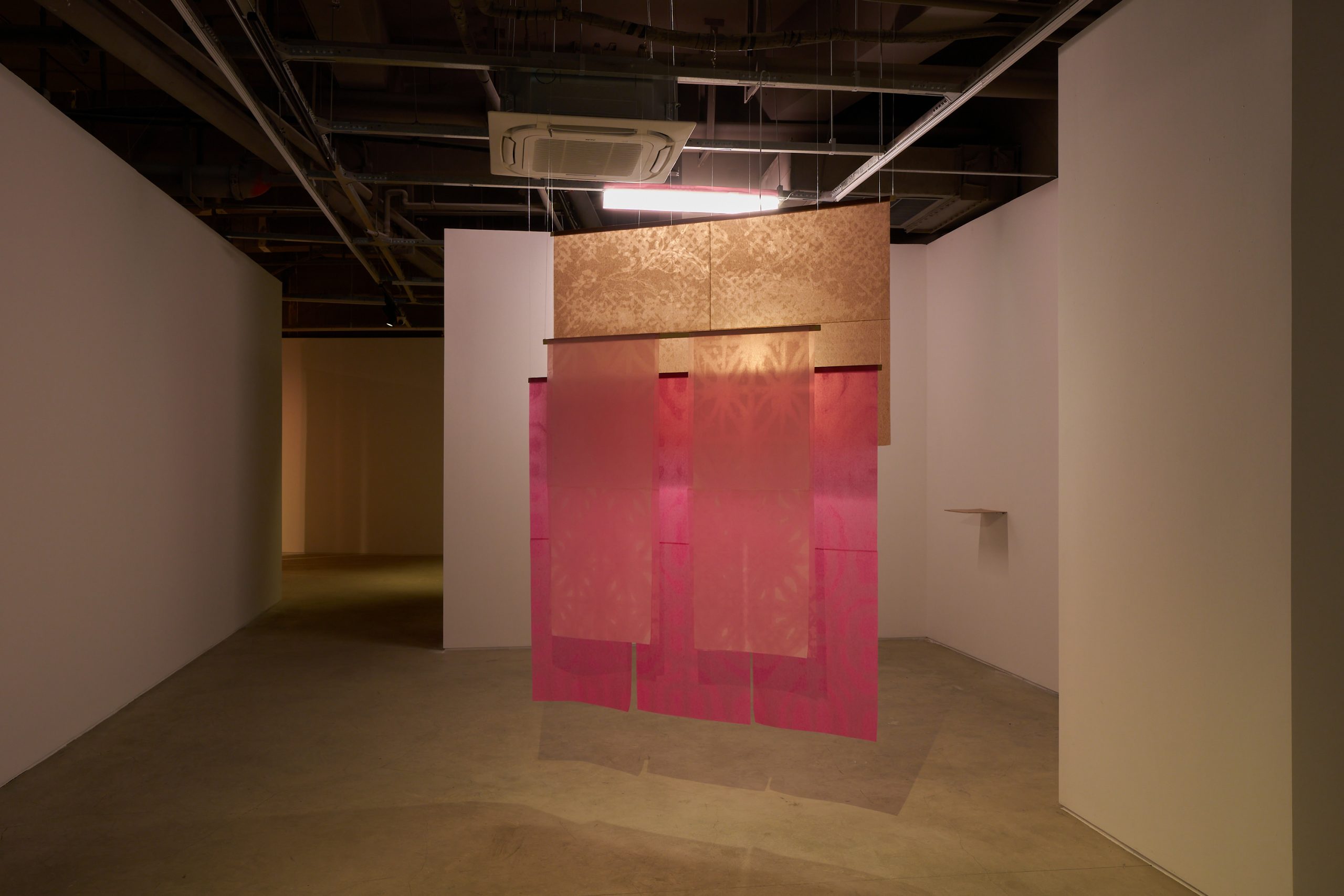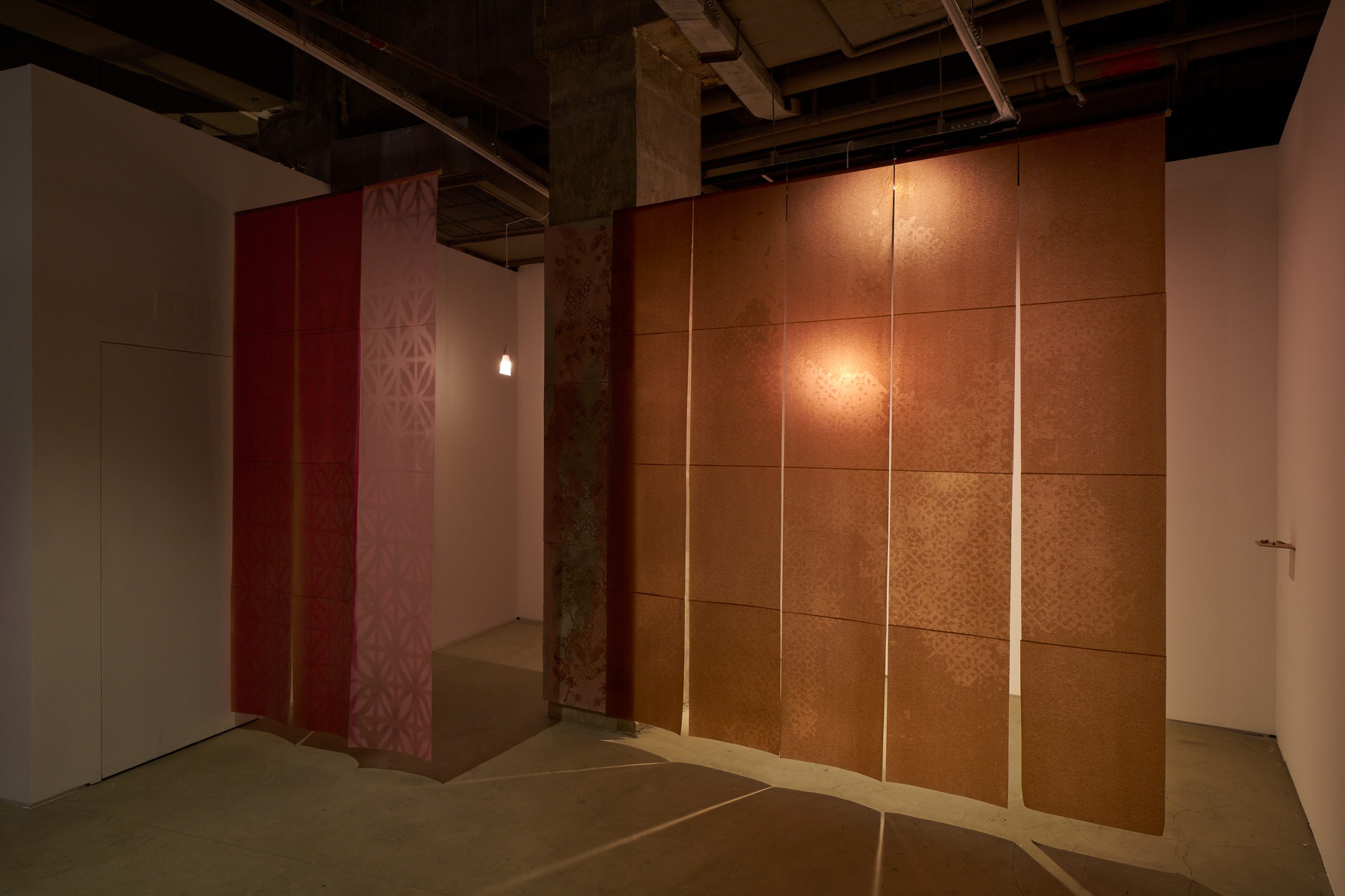 在媒介的选择上,艺术家有意使用和发展具有渗透性质(porous material) 且如有机体般持续变化的材料。香板作品承托的陶瓷面板,其斑驳多孔的表面,既是材料渗透性的视觉隐喻,也记录下香灰燃尽的痕迹;香油蔓延的纸帘以其半透明性介入空间,如古典窗屏看似隔断也似邀请,气味随着纸帘的轻微摆动而扩散,成为观看的延长;浮雕墙由催情香料与墙体装饰涂料融合而成,斑驳的印记如旧时舞厅中日久留下的油渍痕迹,如同附着于皮肤。这些物质与周围环境(包括来访者的身体)进行缓慢而持久的交换,邀请来访者在驻足中体会逐渐于感官中凝聚的欲望张力。正如艺术家研究的现实映照,在中国潮汕地区的“黑舞厅”,那里粉色木板用以遮挡视线,窗框微微透光,夜晚时,中老年的阿姨们卸下一部分的自己,穿上另一部分的自我与珍藏的服装来到舞厅与舞伴赴会。舞厅内幽暗的灯光不均匀地洒在人们的皮肤上,空气中混杂着汗水、香水和肉身的气息。