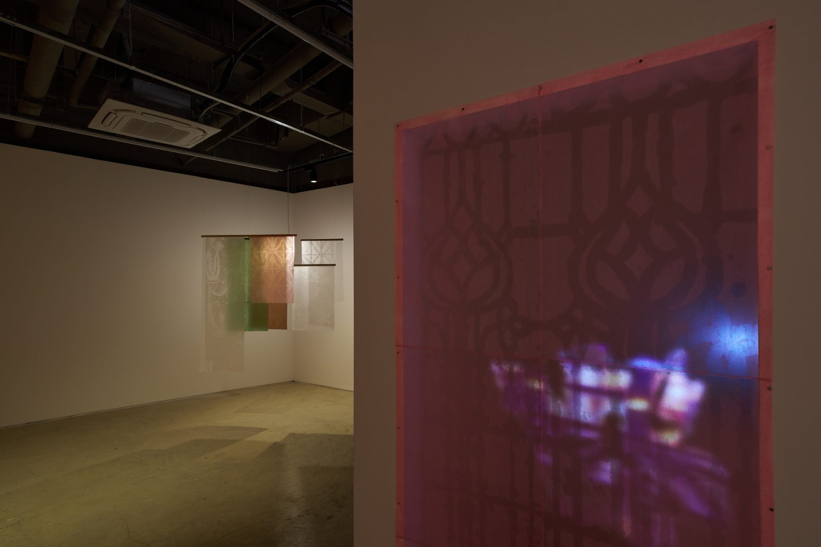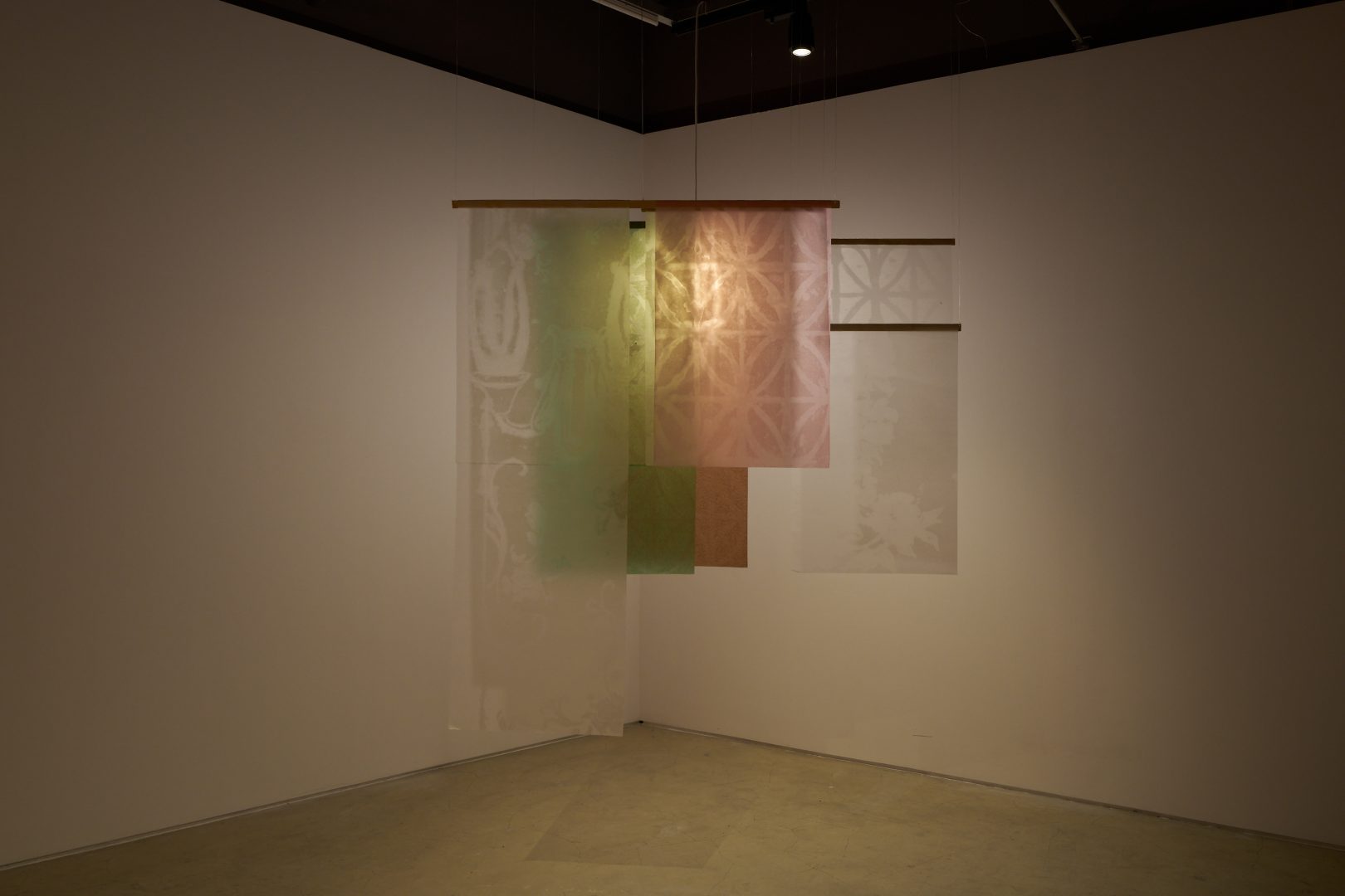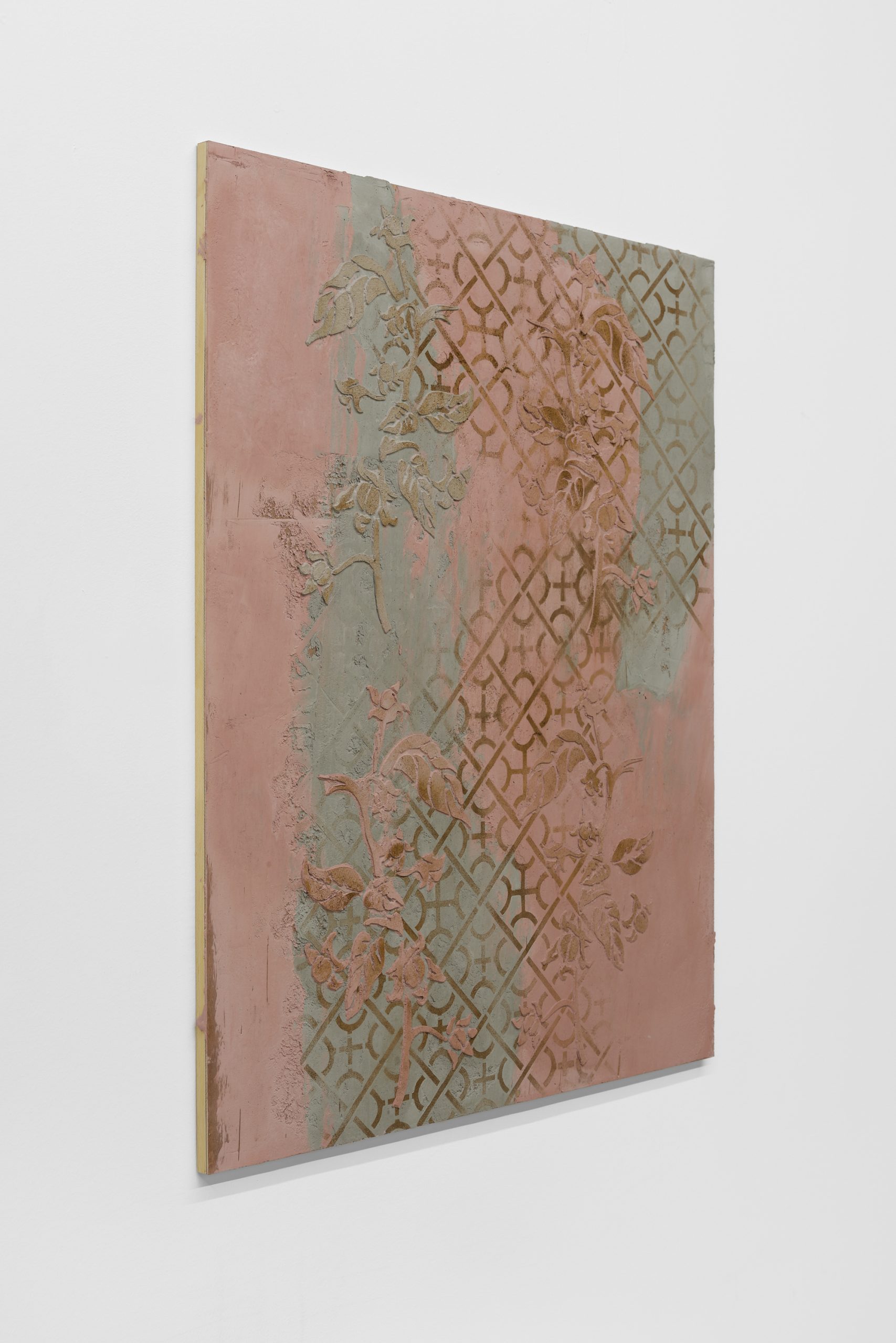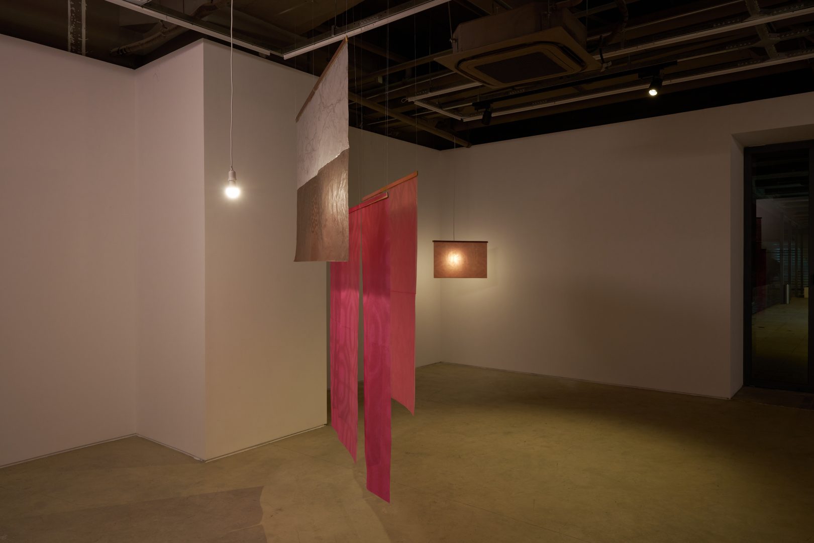 在媒介的选择上,艺术家有意使用和发展具有渗透性质(porous material) 且如有机体般持续变化的材料。香板作品承托的陶瓷面板,其斑驳多孔的表面,既是材料渗透性的视觉隐喻,也记录下香灰燃尽的痕迹;香油蔓延的纸帘以其半透明性介入空间,如古典窗屏看似隔断也似邀请,气味随着纸帘的轻微摆动而扩散,成为观看的延长;浮雕墙由催情香料与墙体装饰涂料融合而成,斑驳的印记如旧时舞厅中日久留下的油渍痕迹,如同附着于皮肤。这些物质与周围环境(包括来访者的身体)进行缓慢而持久的交换,邀请来访者在驻足中体会逐渐于感官中凝聚的欲望张力。正如艺术家研究的现实映照,在中国潮汕地区的“黑舞厅”,那里粉色木板用以遮挡视线,窗框微微透光,夜晚时,中老年的阿姨们卸下一部分的自己,穿上另一部分的自我与珍藏的服装来到舞厅与舞伴赴会。舞厅内幽暗的灯光不均匀地洒在人们的皮肤上,空气中混杂着汗水、香水和肉身的气息。
