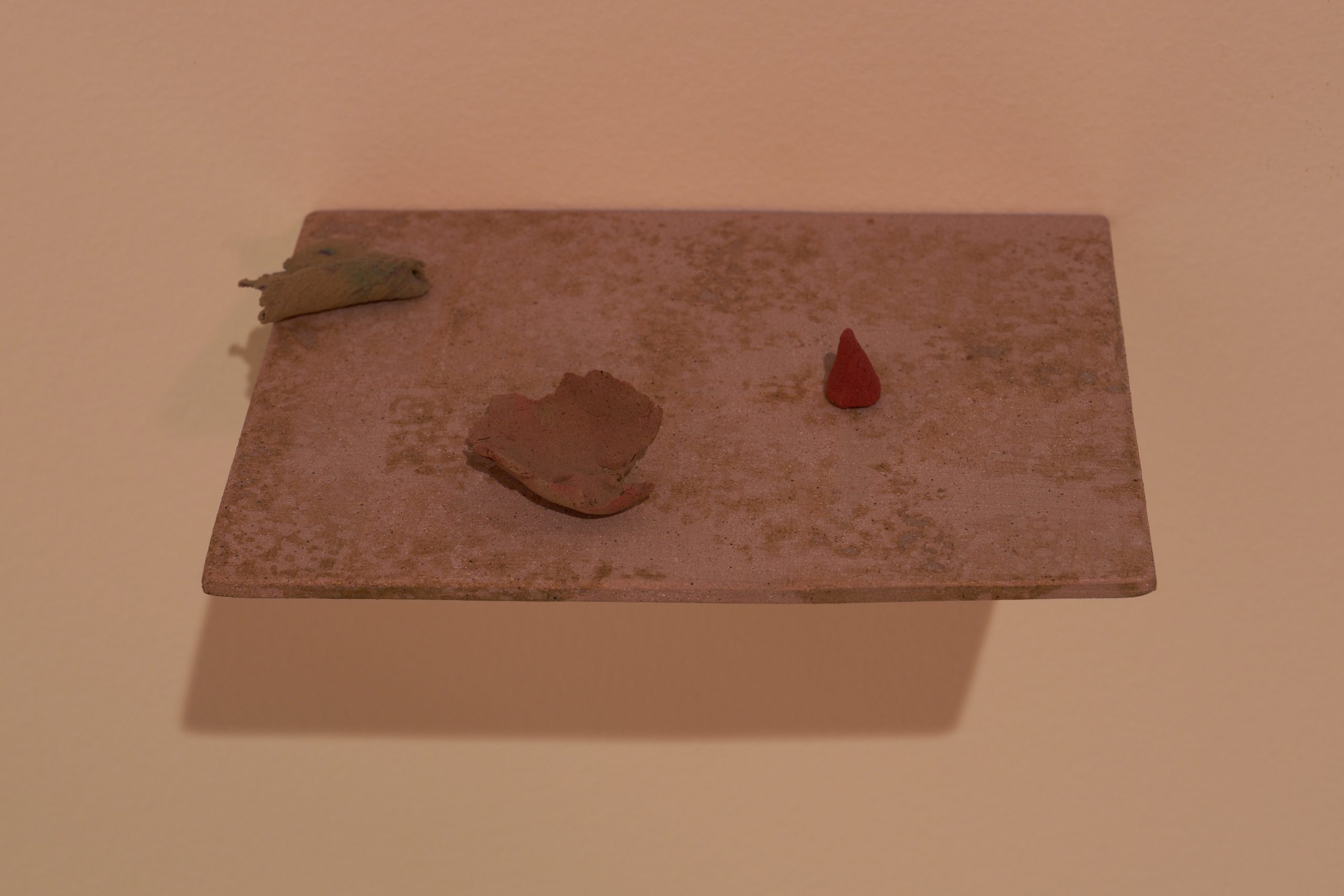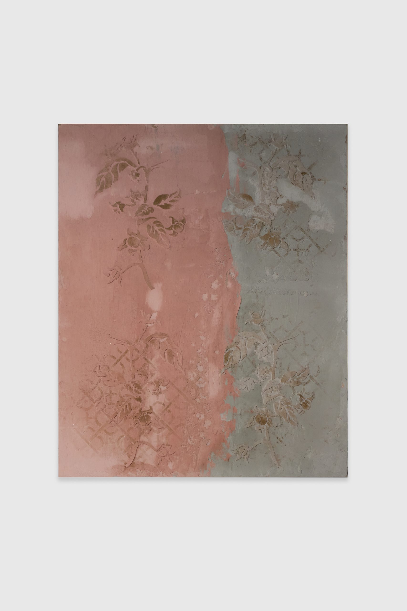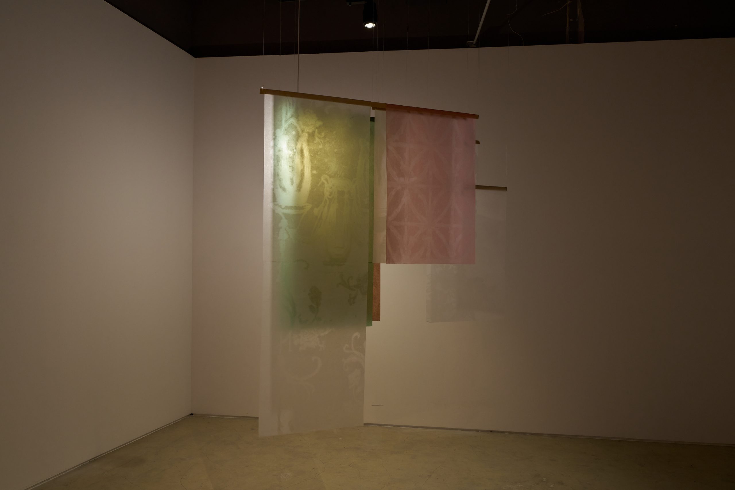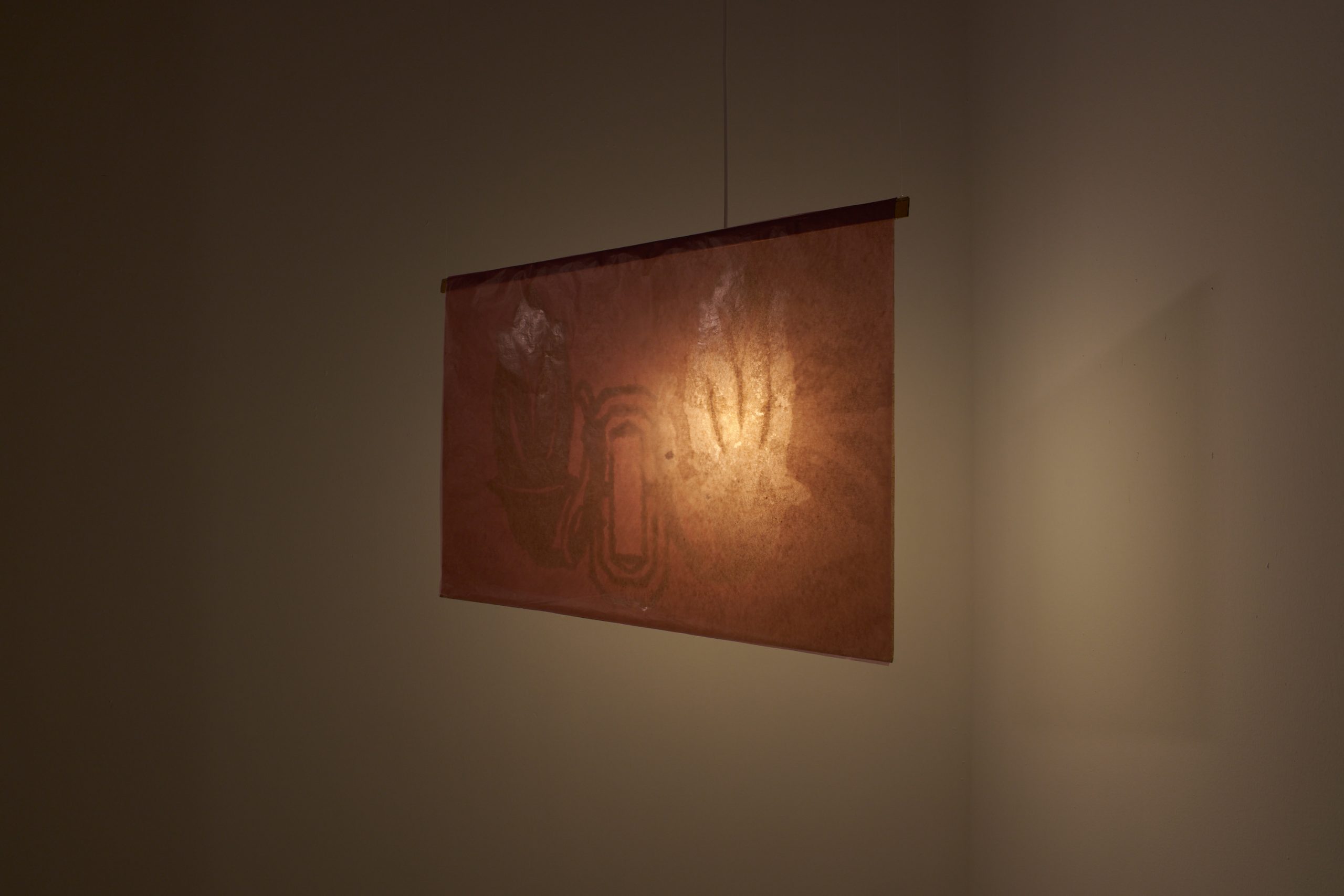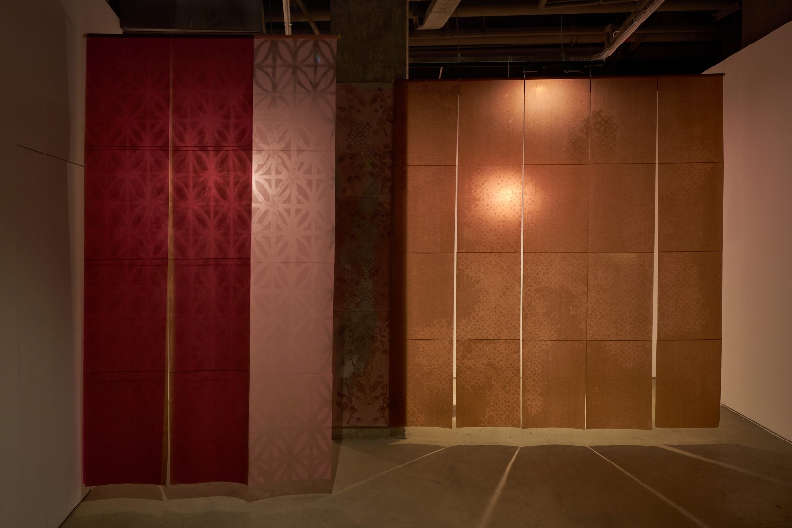 在媒介的选择上,艺术家有意使用和发展具有渗透性质(porous material) 且如有机体般持续变化的材料。香板作品承托的陶瓷面板,其斑驳多孔的表面,既是材料渗透性的视觉隐喻,也记录下香灰燃尽的痕迹;香油蔓延的纸帘以其半透明性介入空间,如古典窗屏看似隔断也似邀请,气味随着纸帘的轻微摆动而扩散,成为观看的延长;浮雕墙由催情香料与墙体装饰涂料融合而成,斑驳的印记如旧时舞厅中日久留下的油渍痕迹,如同附着于皮肤。这些物质与周围环境(包括来访者的身体)进行缓慢而持久的交换,邀请来访者在驻足中体会逐渐于感官中凝聚的欲望张力。正如艺术家研究的现实映照,在中国潮汕地区的“黑舞厅”,那里粉色木板用以遮挡视线,窗框微微透光,夜晚时,中老年的阿姨们卸下一部分的自己,穿上另一部分的自我与珍藏的服装来到舞厅与舞伴赴会。舞厅内幽暗的灯光不均匀地洒在人们的皮肤上,空气中混杂着汗水、香水和肉身的气息。