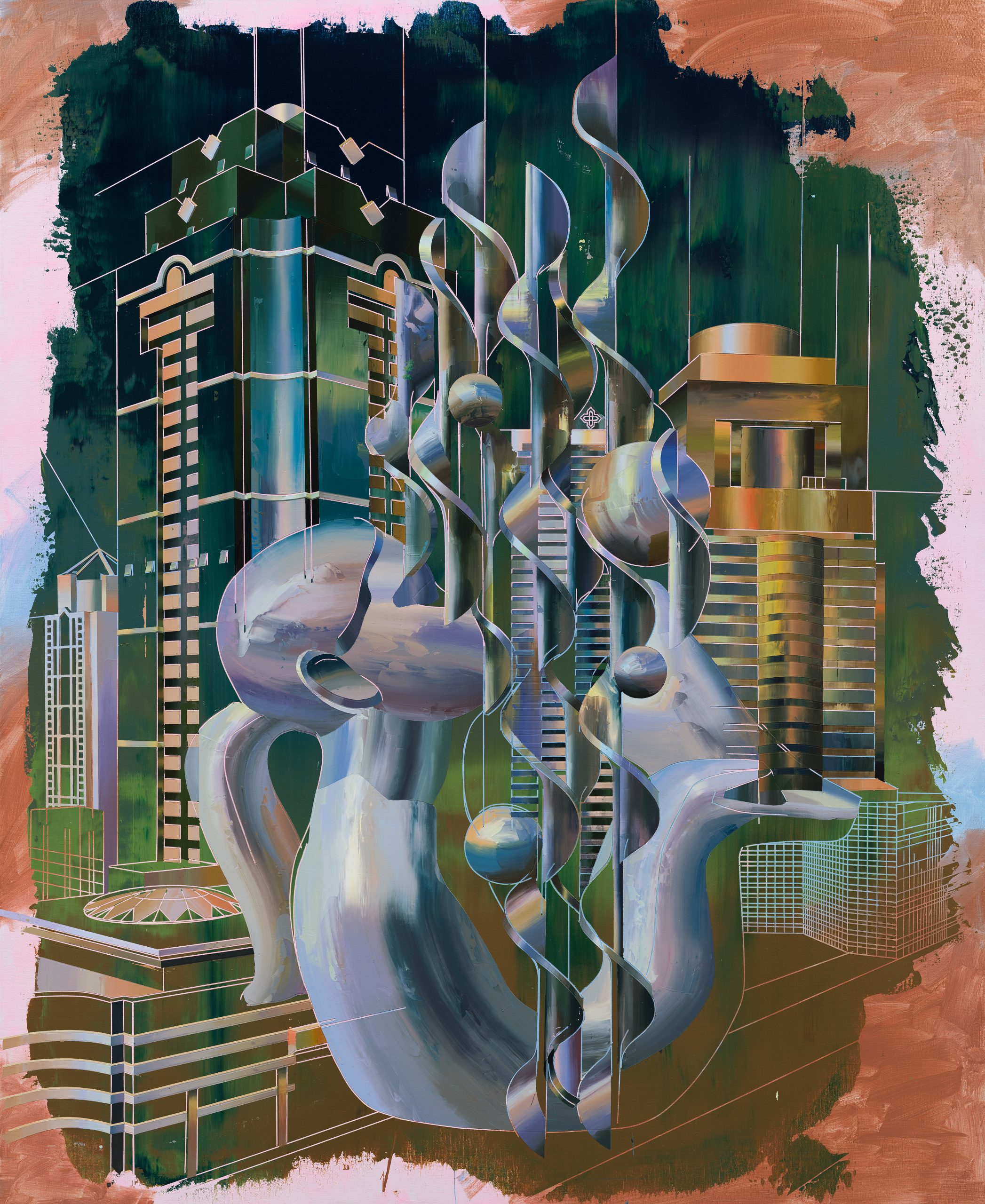 这种将符号的交换价值彻底开发并加以利用的做法在后现代主义浪潮中极大地打通了艺术与建筑之间的创作壁垒,且与现代主义对纯粹形式的捕捉有所映射。尤其针对城市建设与发展的话题,艺术家与建筑师的身份互动更是把空间的概念推向了一个趋于民主的维度。在这个脉络中,成长于八零、九零年代的艺术家崔洁敏感地把握到对中国城市加速更新与扩张进程产生了深刻影响的各类建筑式样,并深谙如何在自己的绘画与雕塑实践中对这些现代化先例进行选择性的回归,从而触发即刻的近未来体验。她的工作所反映的建筑师思维并不单纯在于对建筑元素的拼贴式规划,而是对表皮自治的技术热情以及对地方错置的模型认知。 -
