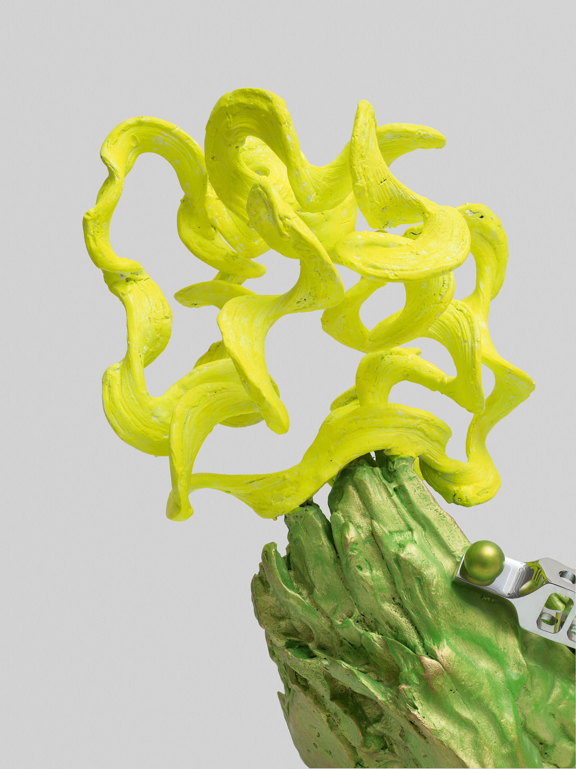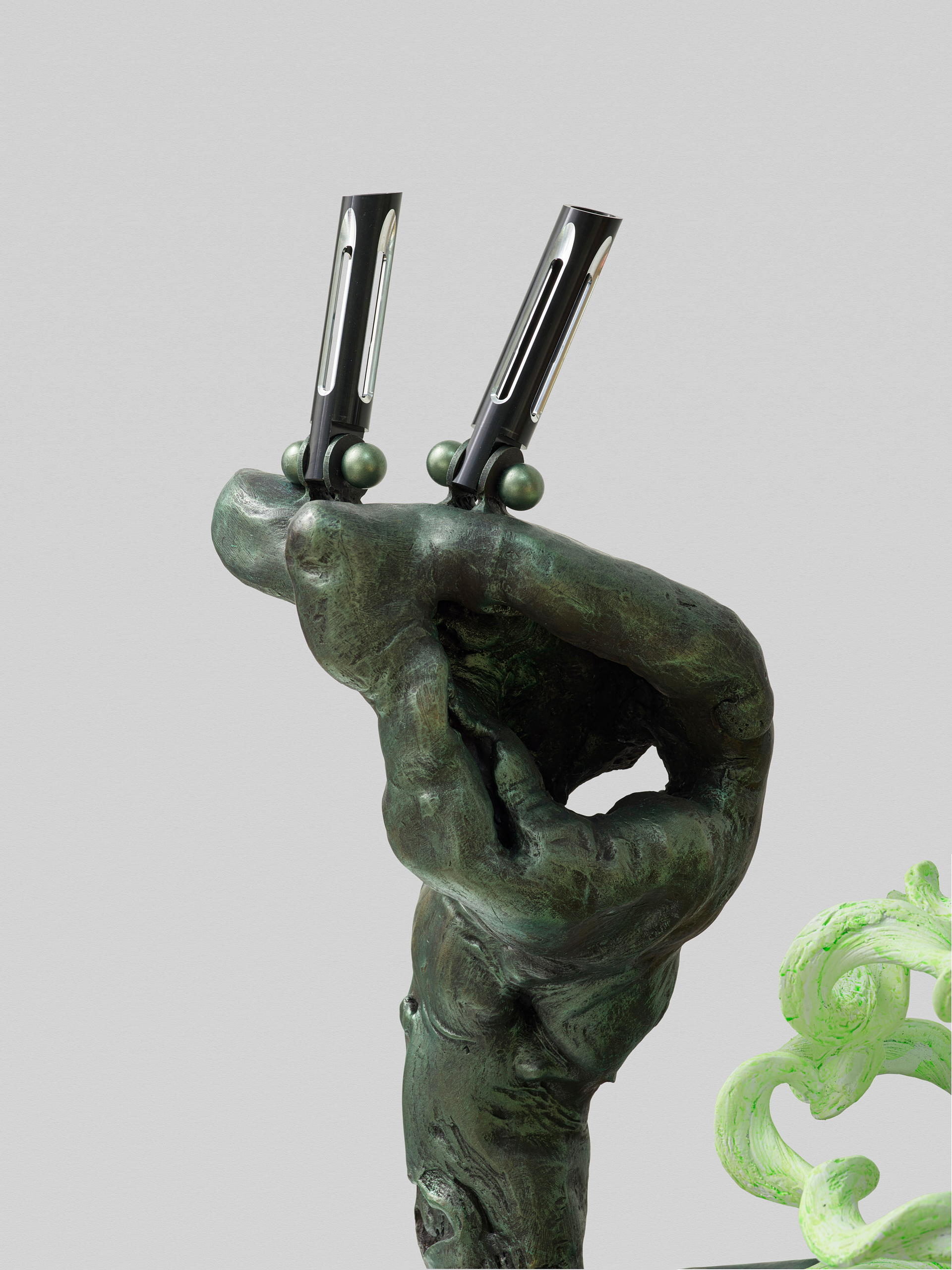 雕塑主体就像一个站立着手握长矛的战士,长矛延伸到地面变成柔软的绳子,也成为植物的茎。他倚靠在圆环背后,也许是他巨大的盾牌,也许是叶片背后的庇护所。