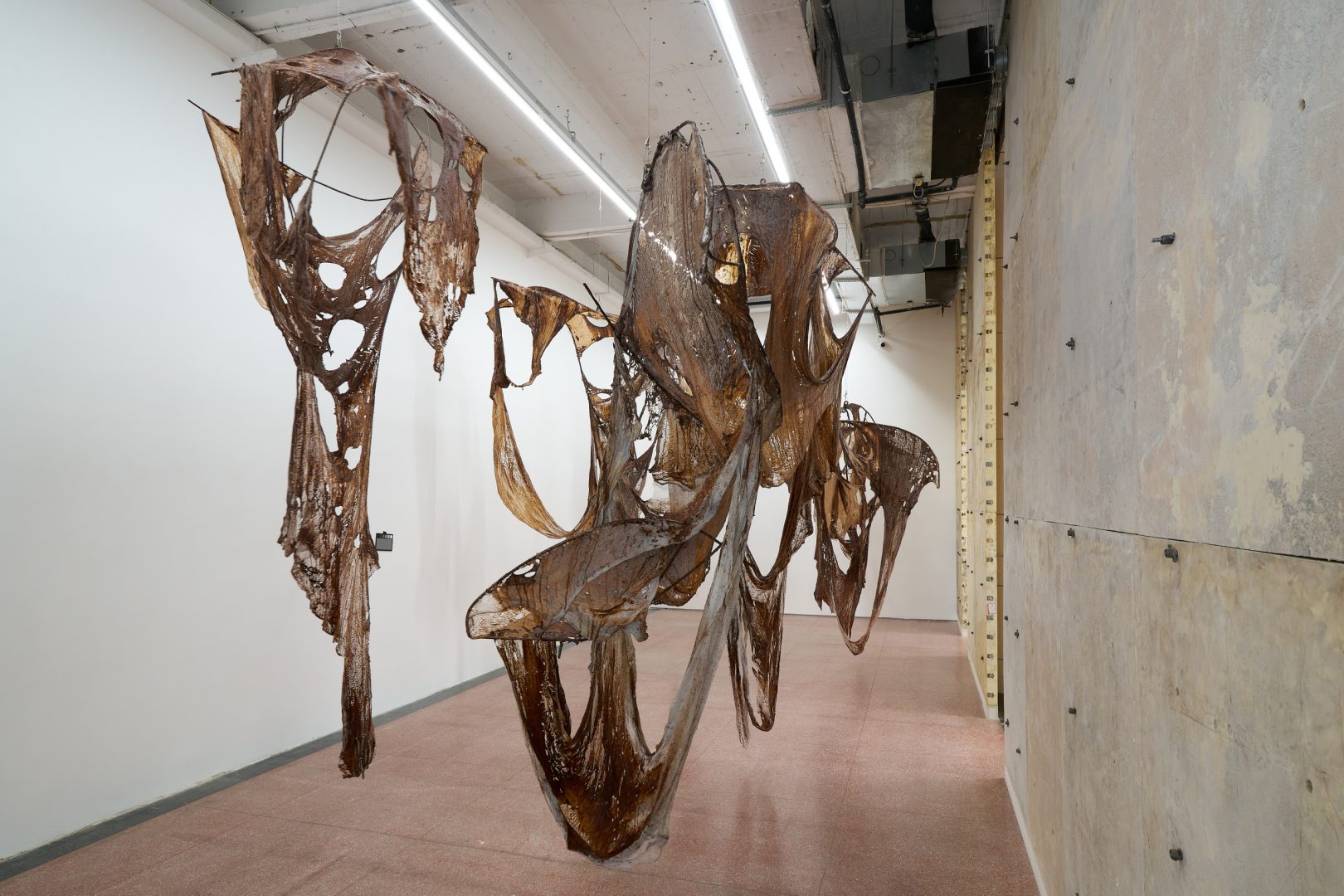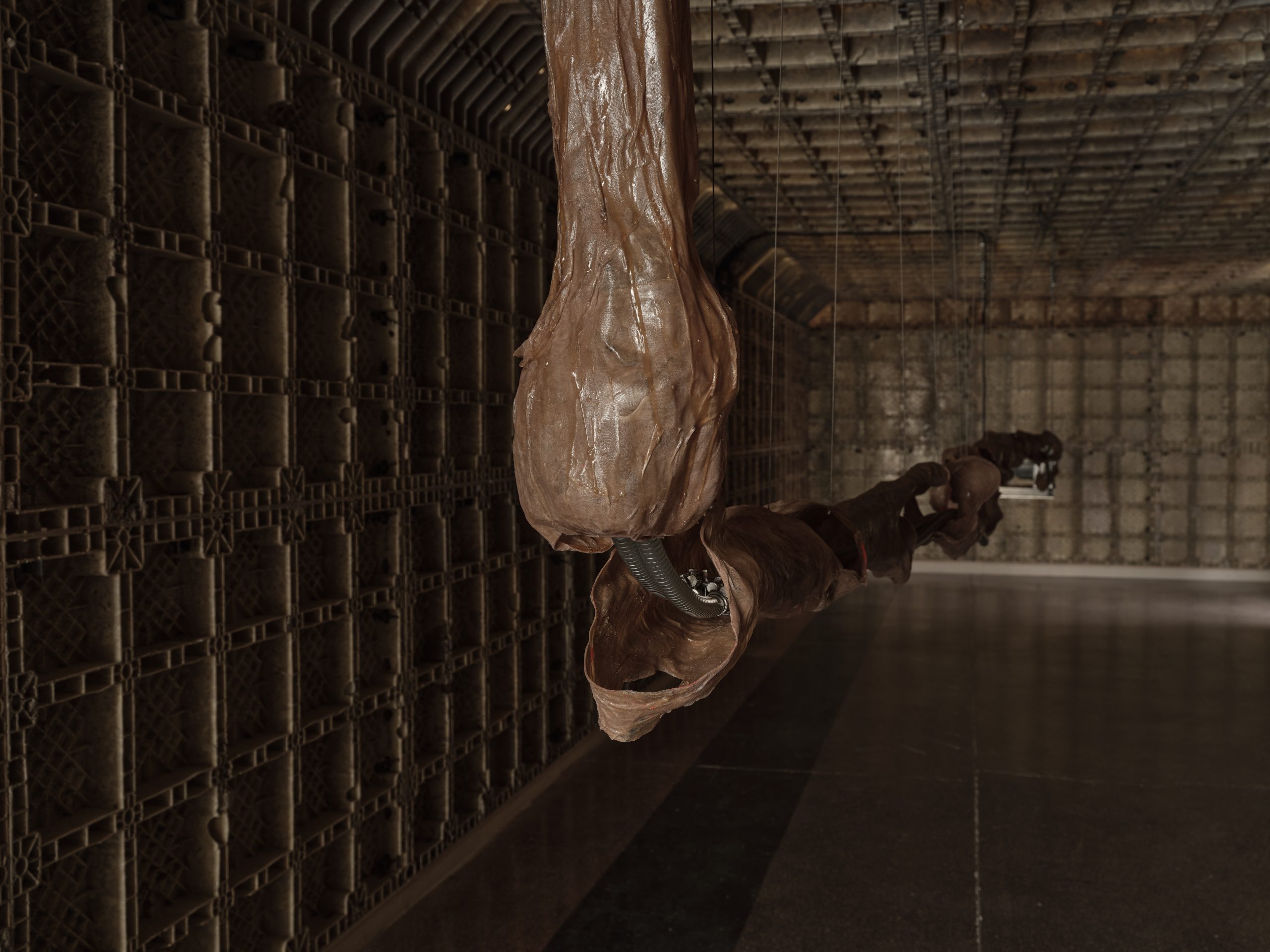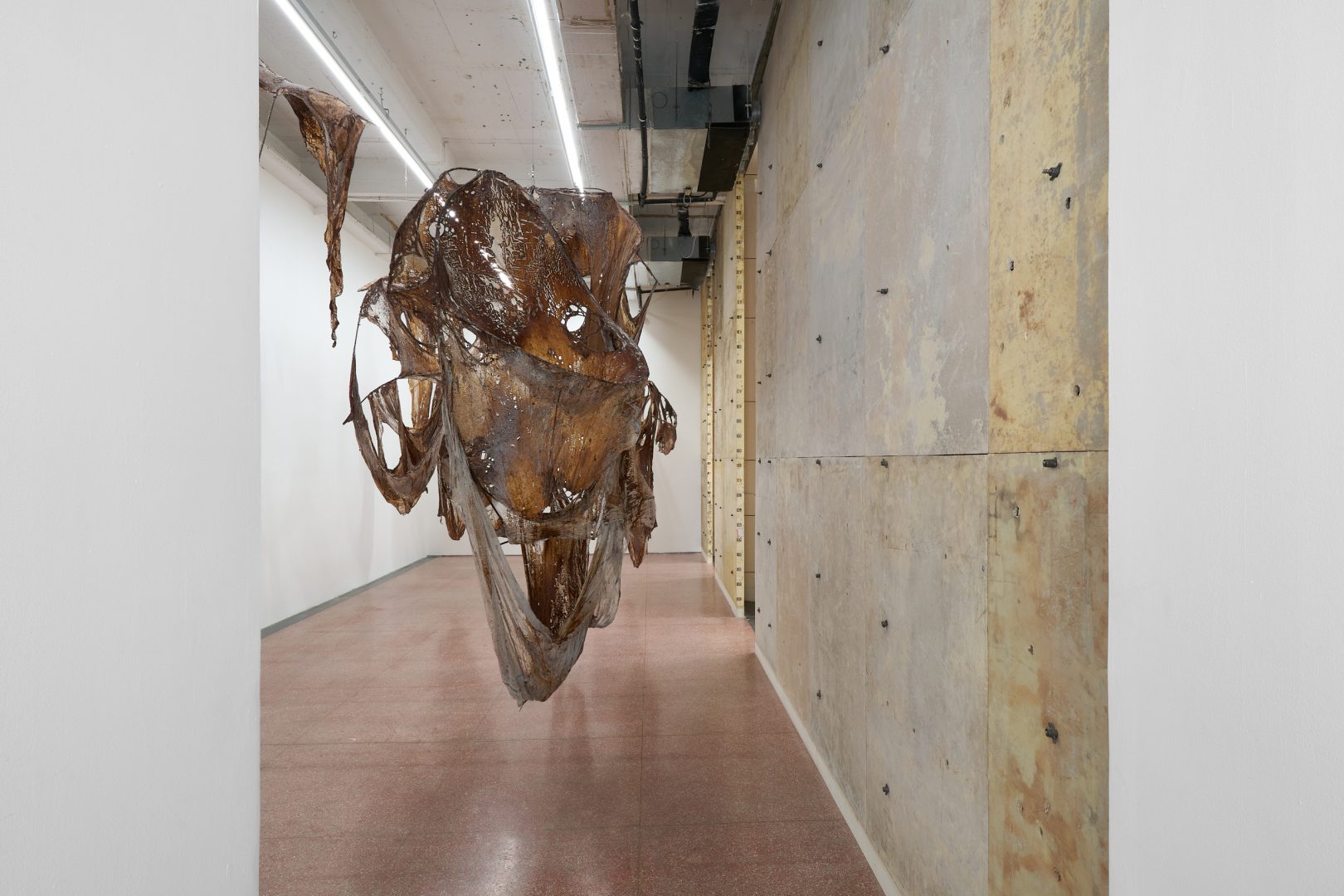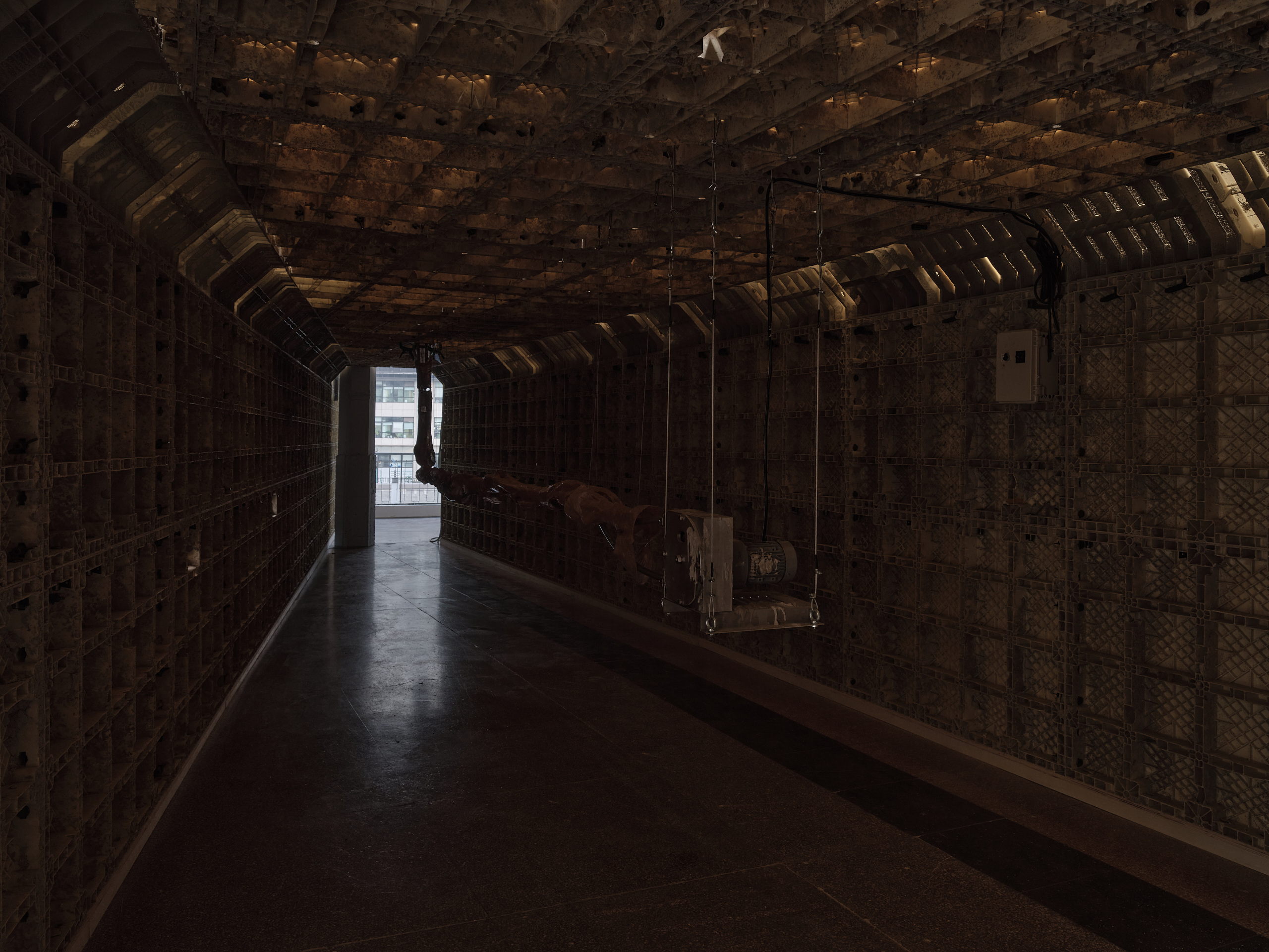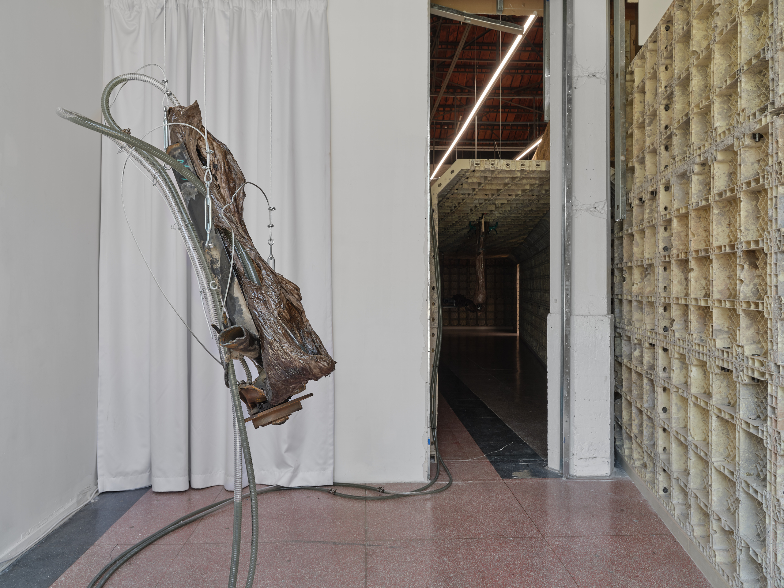 天线空间荣幸呈现李美来个展“Openings”,展出三组大型悬浮雕塑装置,艺术家调用工业材料、机械轴承和零部件,剖开身体、技术、城市的代谢系统内部,制造潦草的、具有感官冲击的视觉场景。展厅的隔墙由二手建筑塑钢模板搭建,这是一种浇筑混凝土使用的临时模型,可被回收和重复使用,残留着历史的水泥渍和磨损痕迹。展厅入口,七件从伦敦泰特现代美术馆涡轮大厅的巨型装置中“剥落”的“皮肤”雕塑被成排悬挂,被异化的劳动者卷入自动化和生产复制,敞开的伤口持续展示着肉体损耗和被剥削的撕裂感。进入展厅的第二个隔间,悬浮着的巨大结构陈列着由骨胶翻模制成的一系列“外壳”,模拟动物蜕壳的生物学机制,翻制自人体躯干和汽车桥壳,构成一座状如城市建筑沙盘的结构。展厅的另一边,横梗的隧道邀请观众从它的三个“肛门”,即装有轴承的孔洞入侵。隧道内,在不同模型和雕塑之间,硅胶软管如电缆般穿过另一组骨胶雕塑,形成一个闭环的循环系统,泵送着某种绿色不明体液,而在隧道尽头,可以从展厅玻璃眺望到在亚洲快速工业化城市随处可见的绿色河水——另一种掺杂了工业排泄的城市循环。
