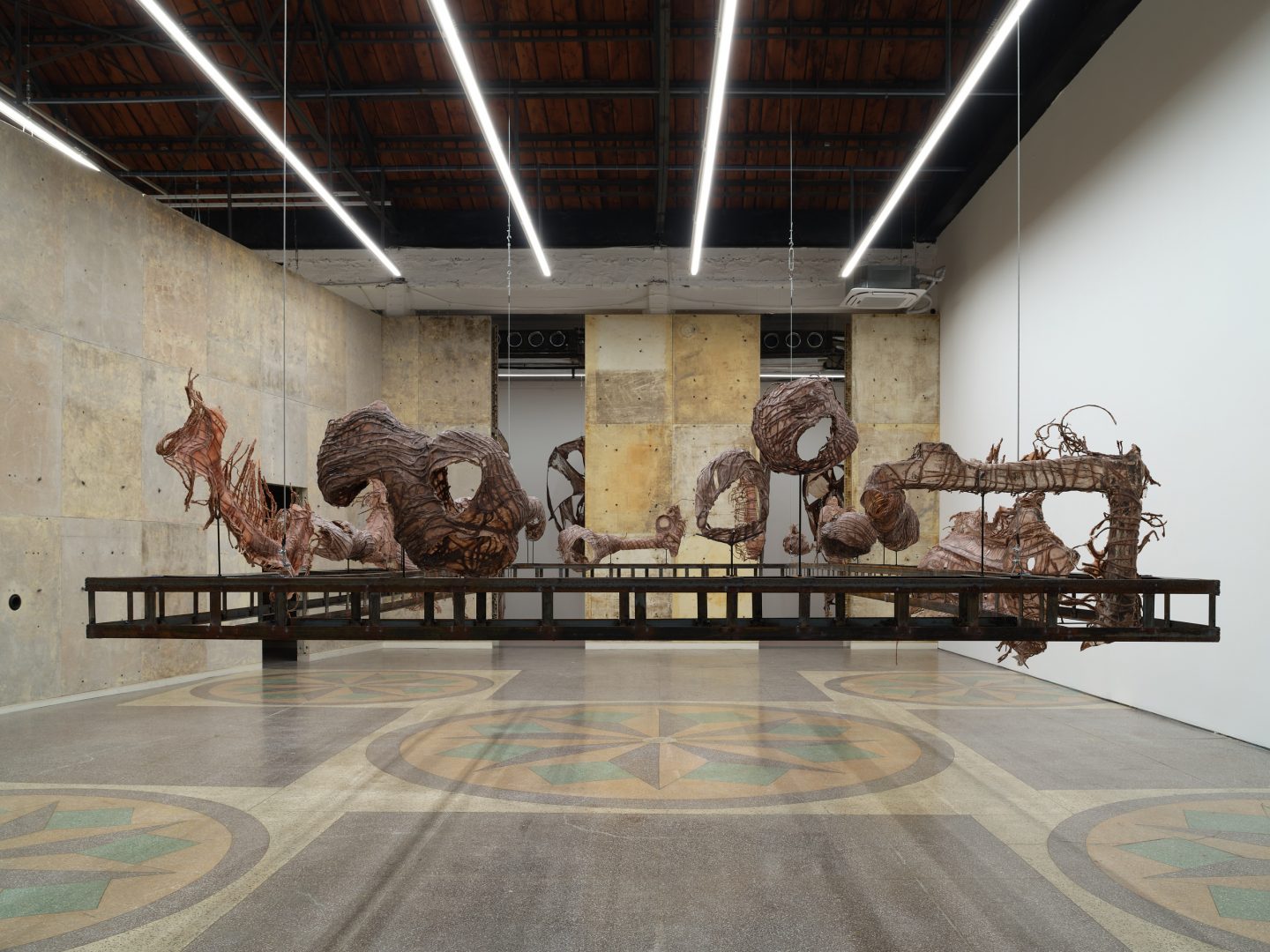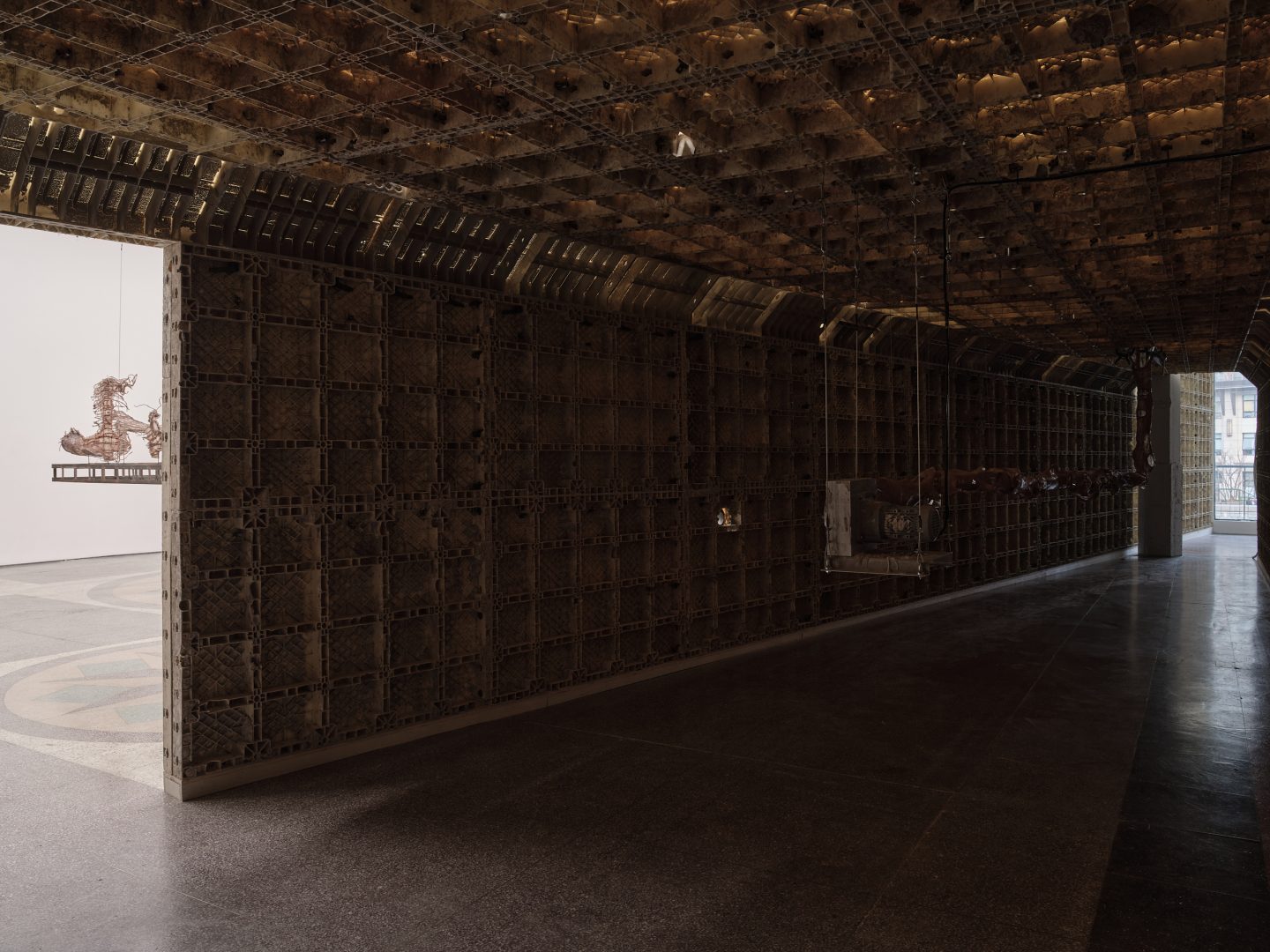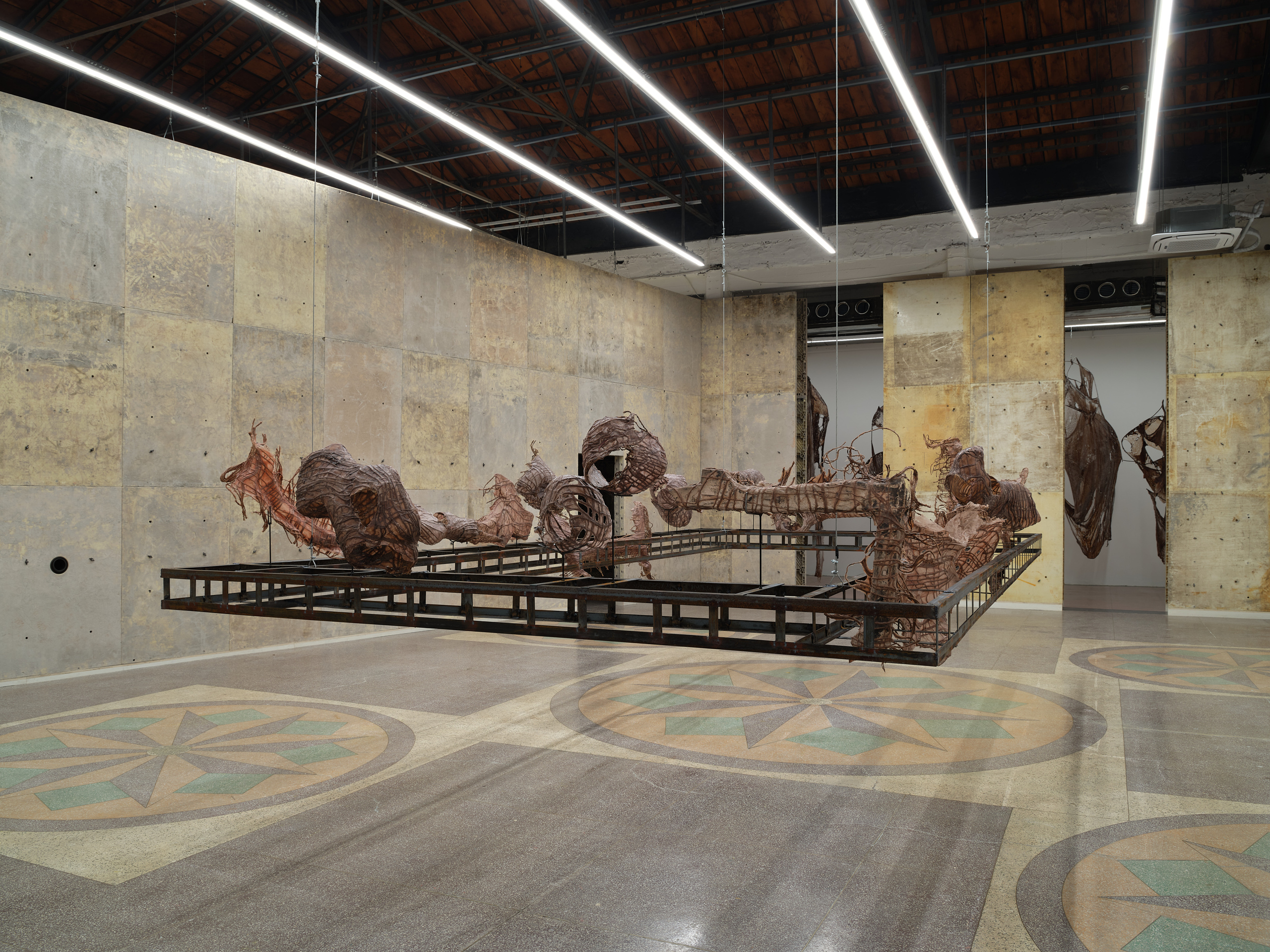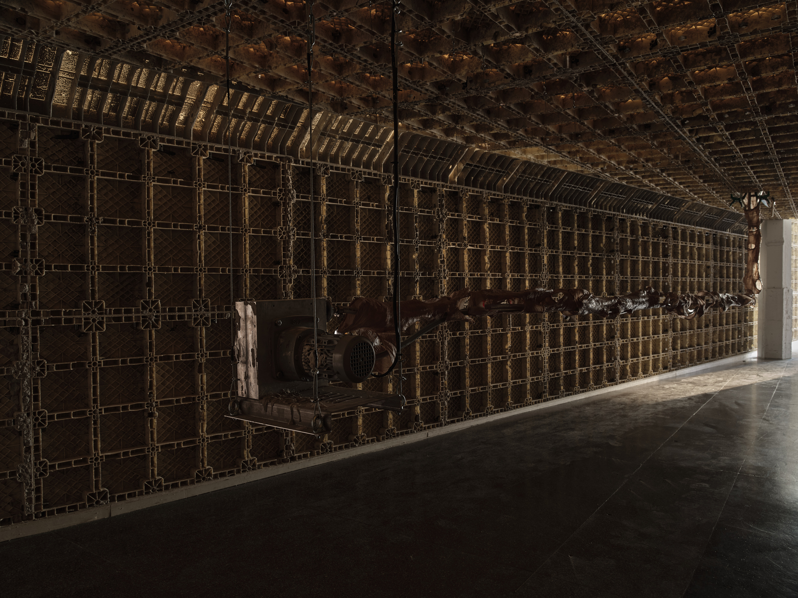天线空间荣幸呈现李美来个展“Openings”,展出三组大型悬浮雕塑装置,艺术家调用工业材料、机械轴承和零部件,剖开身体、技术、城市的代谢系统内部,制造潦草的、具有感官冲击的视觉场景。展厅的隔墙由二手建筑塑钢模板搭建,这是一种浇筑混凝土使用的临时模型,可被回收和重复使用,残留着历史的水泥渍和磨损痕迹。展厅入口,七件从伦敦泰特现代美术馆涡轮大厅的巨型装置中“剥落”的“皮肤”雕塑被成排悬挂,被异化的劳动者卷入自动化和生产复制,敞开的伤口持续展示着肉体损耗和被剥削的撕裂感。进入展厅的第二个隔间,悬浮着的巨大结构陈列着由骨胶翻模制成的一系列“外壳”,模拟动物蜕壳的生物学机制,翻制自人体躯干和汽车桥壳,构成一座状如城市建筑沙盘的结构。展厅的另一边,横梗的隧道邀请观众从它的三个“肛门”,即装有轴承的孔洞入侵。隧道内,在不同模型和雕塑之间,硅胶软管如电缆般穿过另一组骨胶雕塑,形成一个闭环的循环系统,泵送着某种绿色不明体液,而在隧道尽头,可以从展厅玻璃眺望到在亚洲快速工业化城市随处可见的绿色河水——另一种掺杂了工业排泄的城市循环。