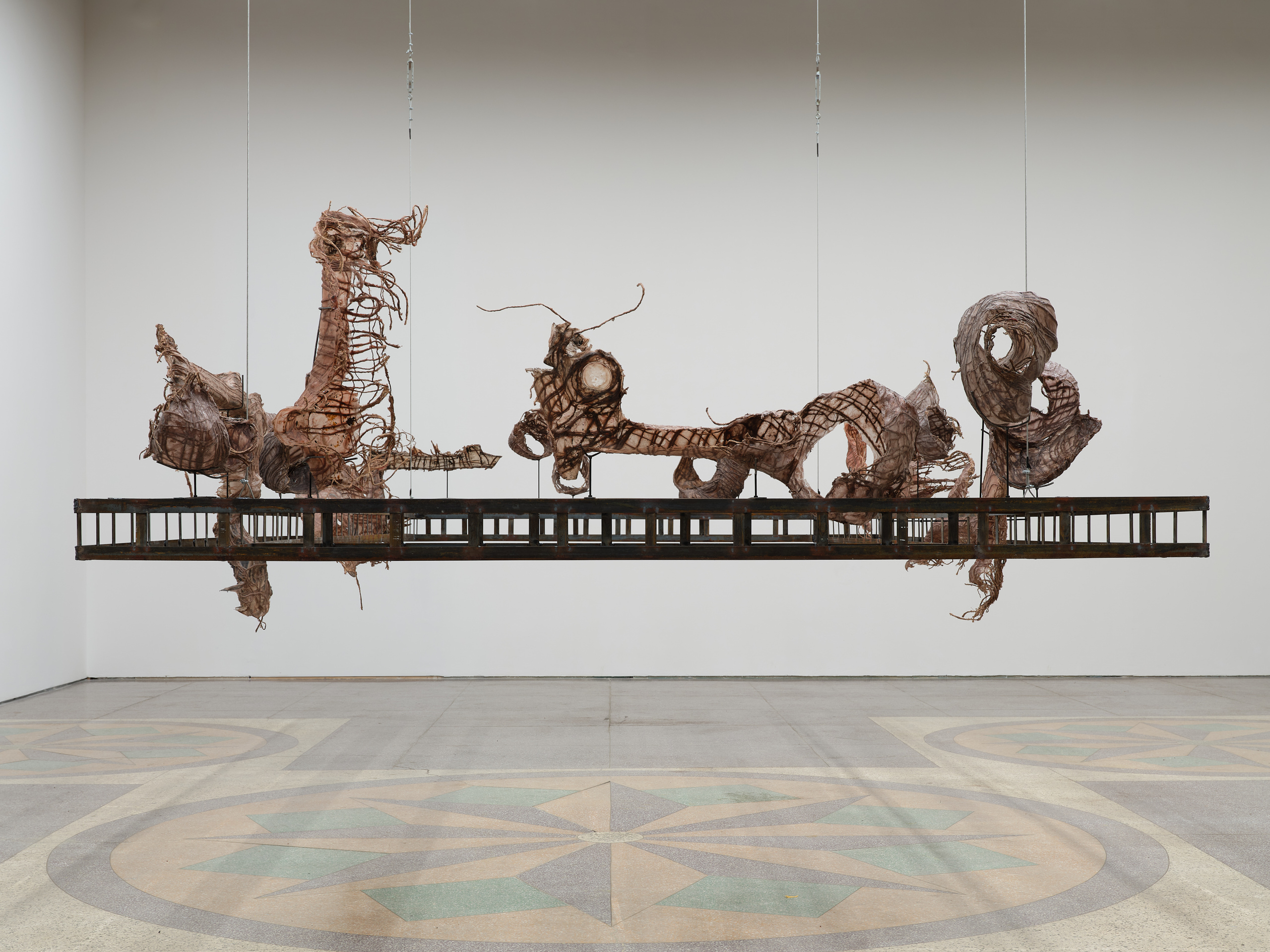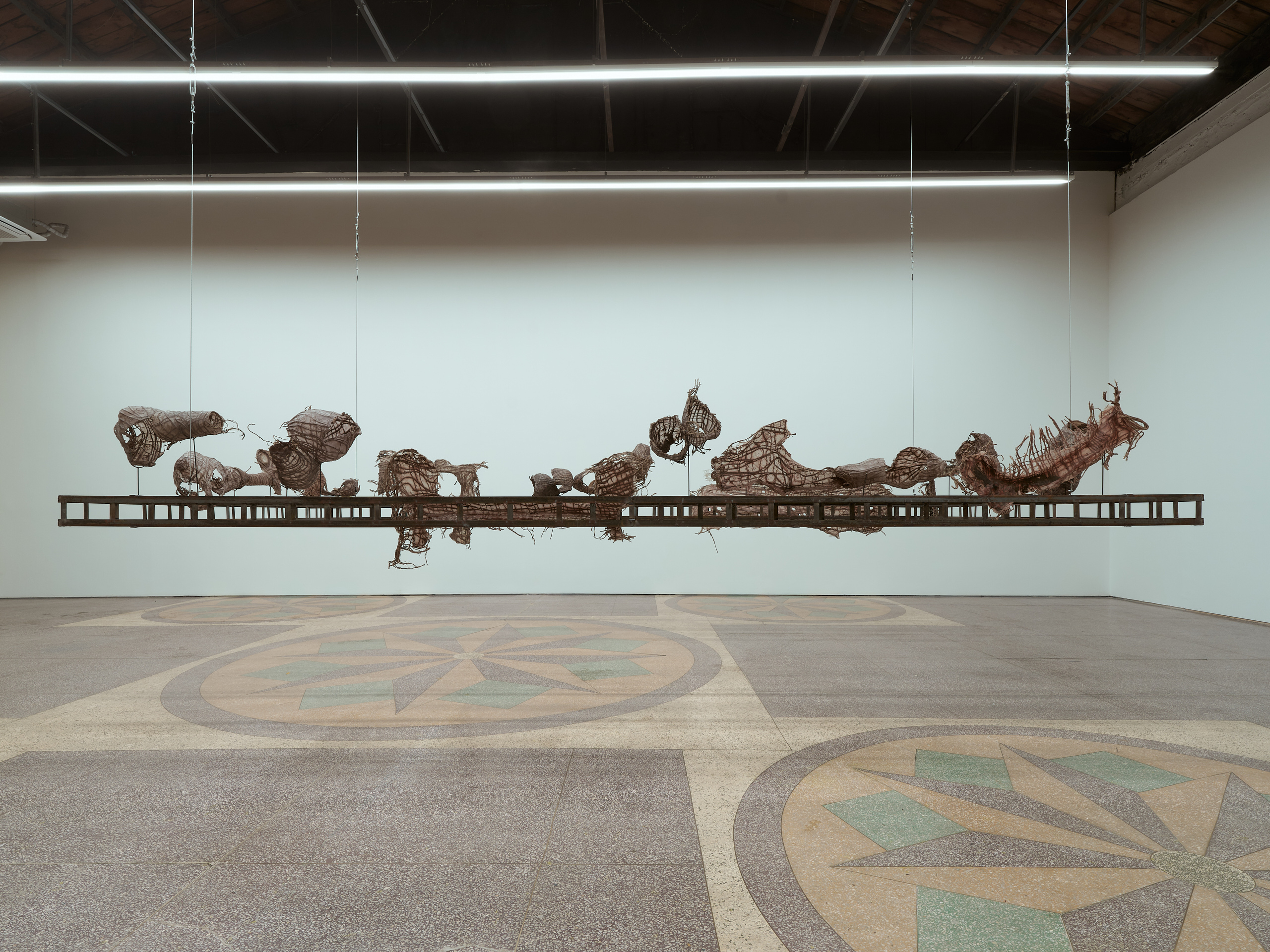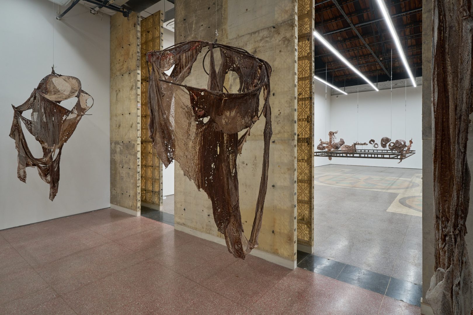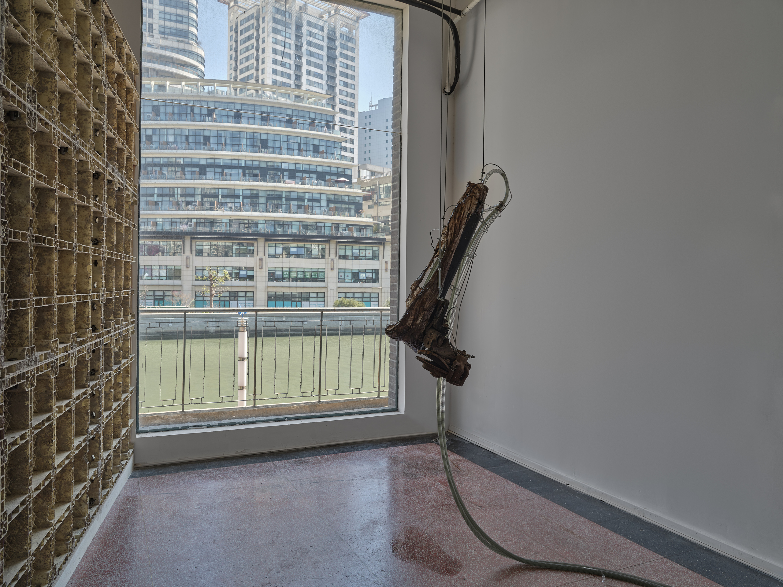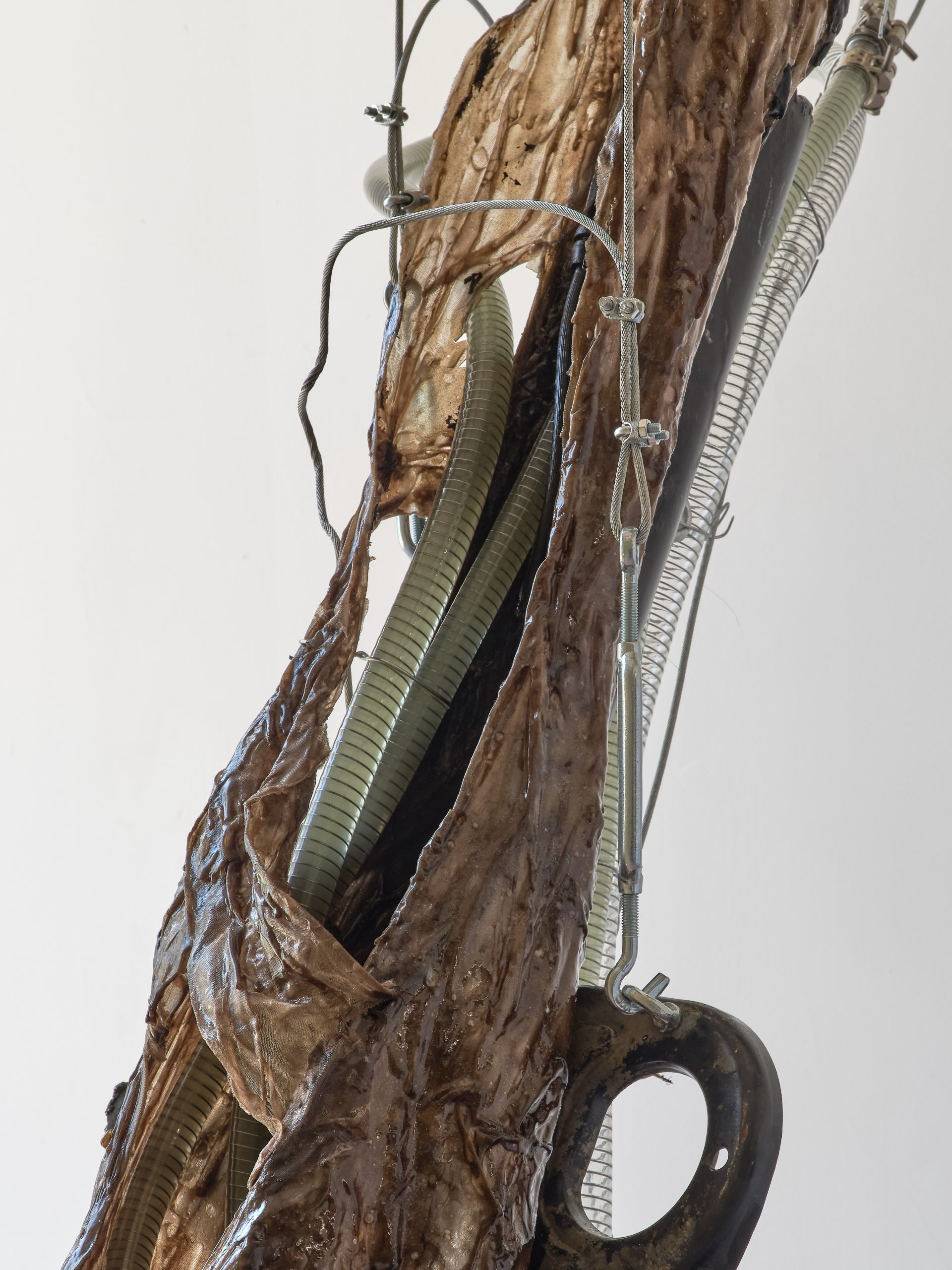 天线空间荣幸呈现李美来个展“Openings”,展出三组大型悬浮雕塑装置,艺术家调用工业材料、机械轴承和零部件,剖开身体、技术、城市的代谢系统内部,制造潦草的、具有感官冲击的视觉场景。展厅的隔墙由二手建筑塑钢模板搭建,这是一种浇筑混凝土使用的临时模型,可被回收和重复使用,残留着历史的水泥渍和磨损痕迹。展厅入口,七件从伦敦泰特现代美术馆涡轮大厅的巨型装置中“剥落”的“皮肤”雕塑被成排悬挂,被异化的劳动者卷入自动化和生产复制,敞开的伤口持续展示着肉体损耗和被剥削的撕裂感。进入展厅的第二个隔间,悬浮着的巨大结构陈列着由骨胶翻模制成的一系列“外壳”,模拟动物蜕壳的生物学机制,翻制自人体躯干和汽车桥壳,构成一座状如城市建筑沙盘的结构。展厅的另一边,横梗的隧道邀请观众从它的三个“肛门”,即装有轴承的孔洞入侵。隧道内,在不同模型和雕塑之间,硅胶软管如电缆般穿过另一组骨胶雕塑,形成一个闭环的循环系统,泵送着某种绿色不明体液,而在隧道尽头,可以从展厅玻璃眺望到在亚洲快速工业化城市随处可见的绿色河水——另一种掺杂了工业排泄的城市循环。