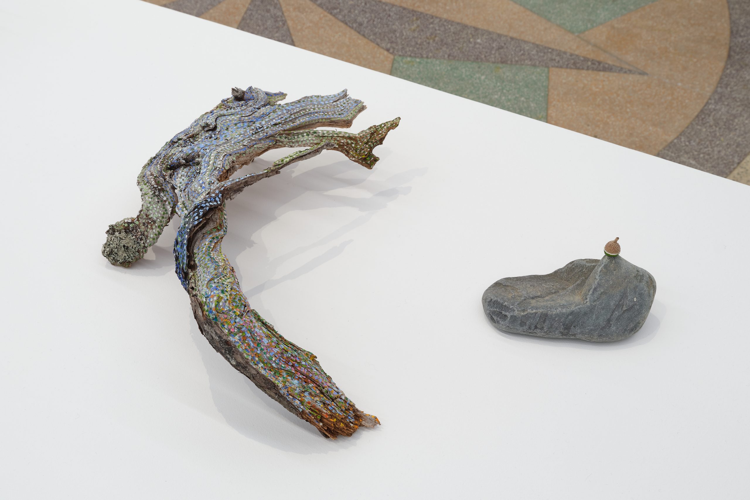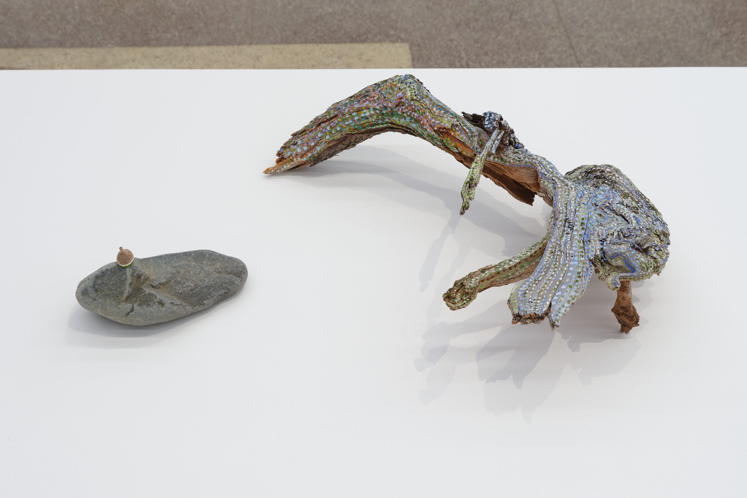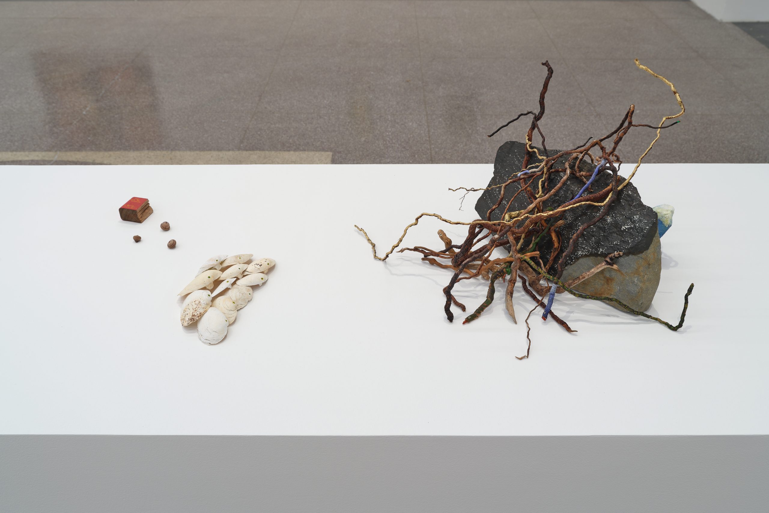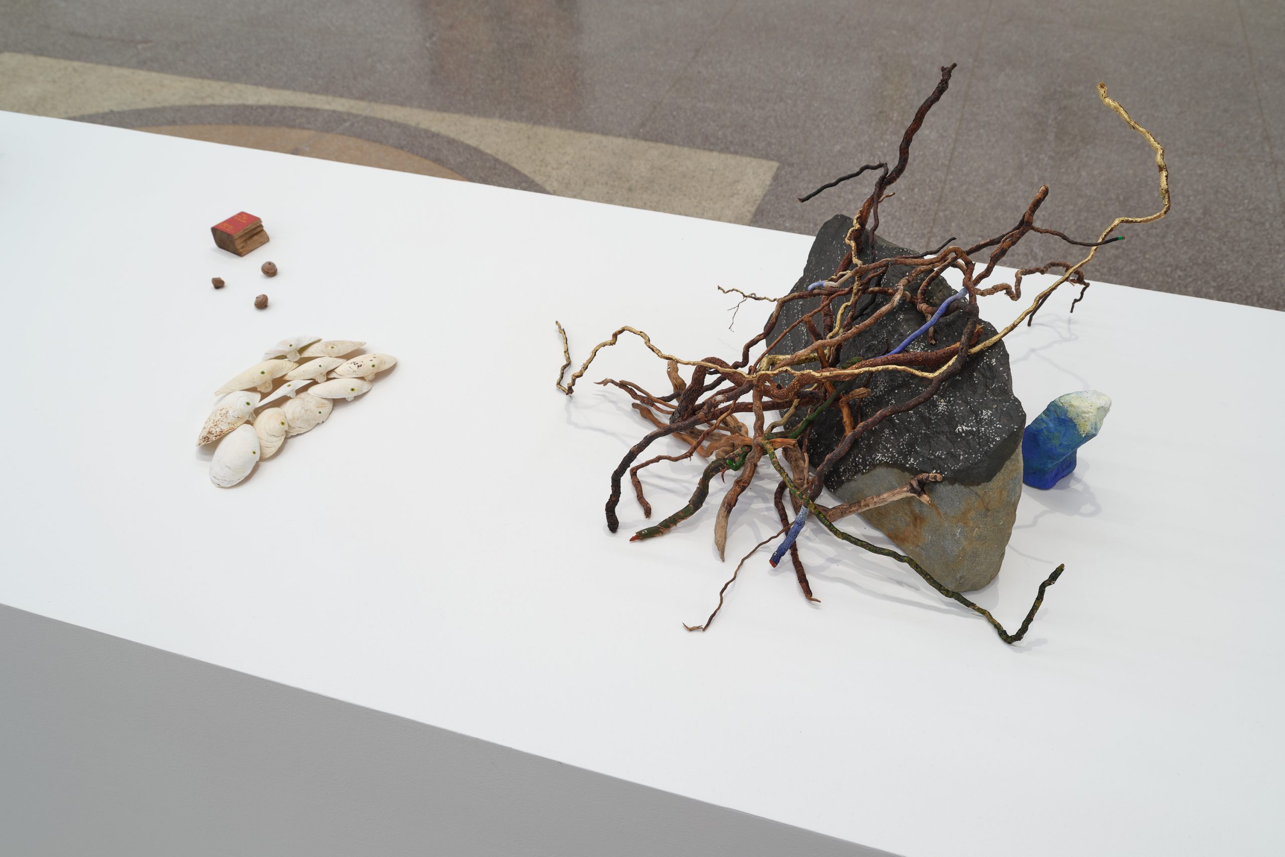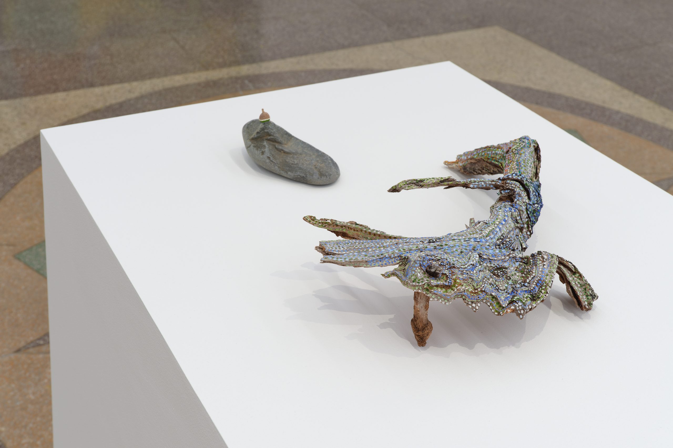 《奉养无尽光》这幅画作描绘了一个轰然诞生又悄然消逝的宇宙,万物彼此穿透,一切尽处于流动中。题为《智慧之雨》的雕塑群中,一群只被赋予一只眼睛的贝壳望向我们。又或者,它们其实是通过睁开的独眼,为我们开启了一扇窥见万花筒般超现实的窗?当画作与雕塑共同呈现,它们便合谋上演一场游戏,巧妙揭示那些处于我们世界,并作为我们世界本身,正在发生的诸种现实间深刻的共生关系。