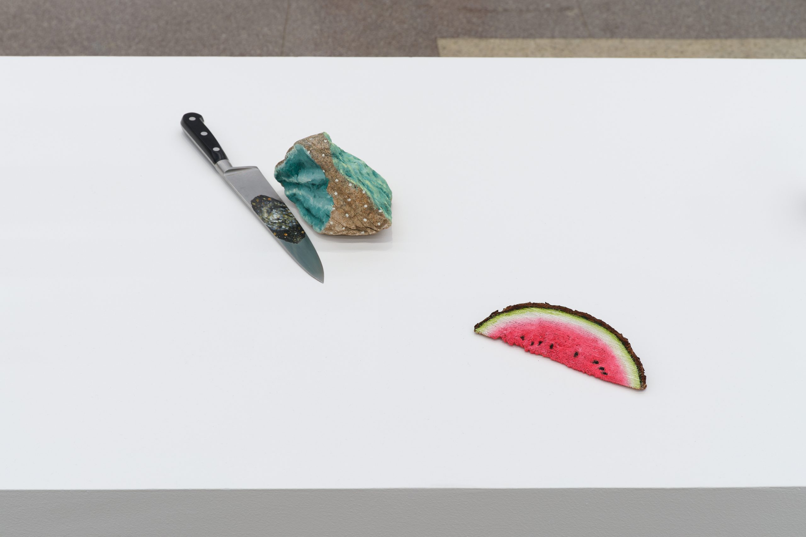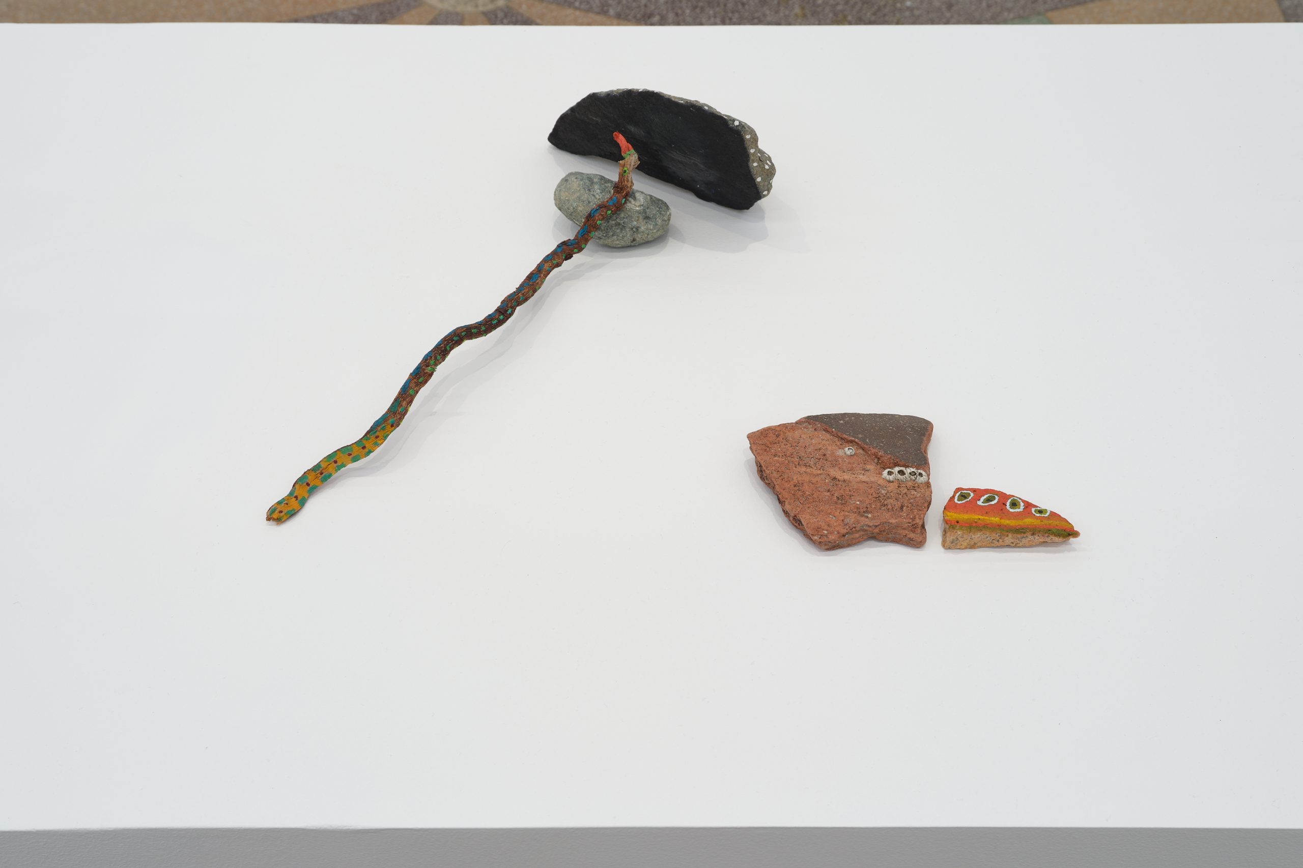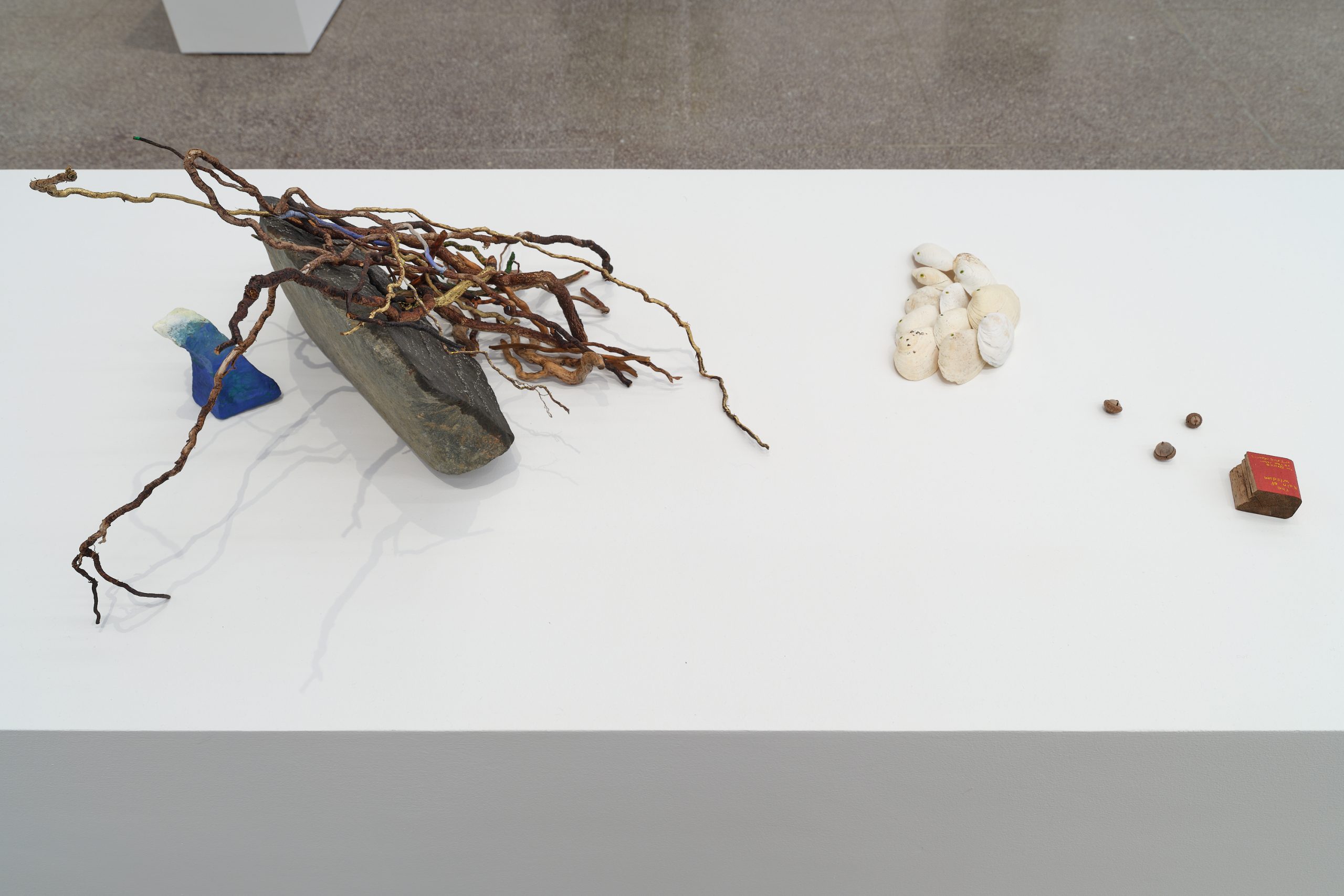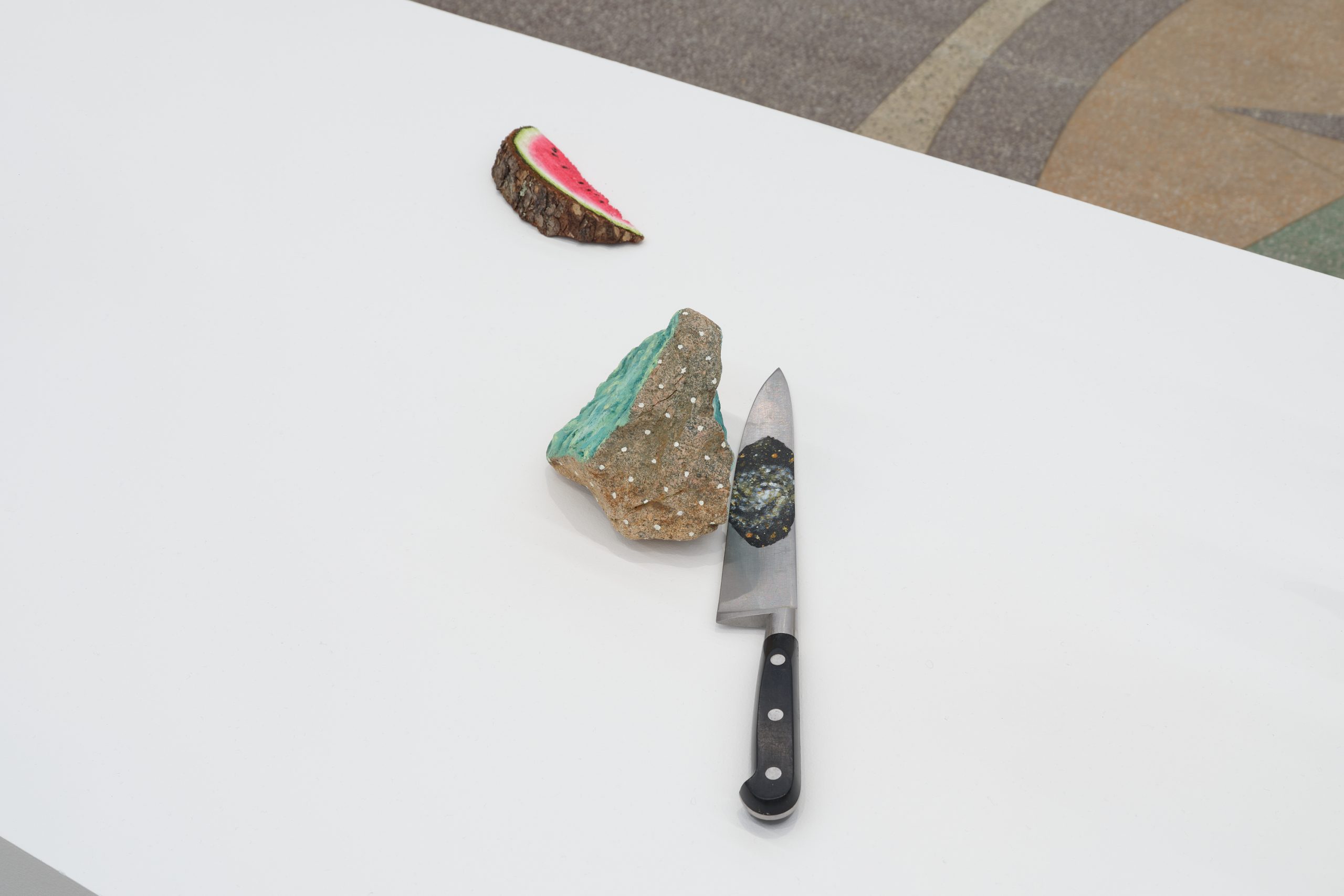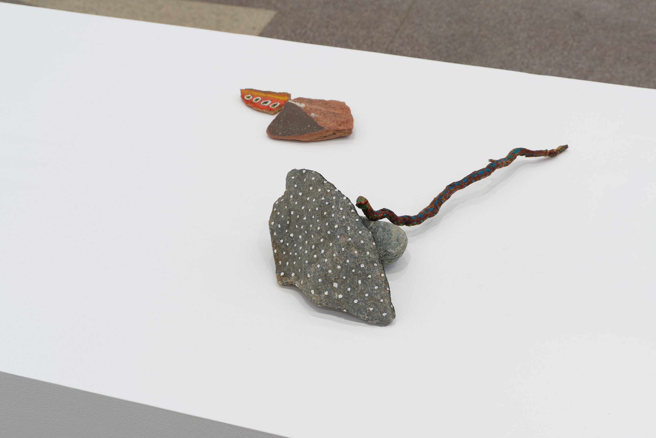 《奉养无尽光》这幅画作描绘了一个轰然诞生又悄然消逝的宇宙,万物彼此穿透,一切尽处于流动中。题为《智慧之雨》的雕塑群中,一群只被赋予一只眼睛的贝壳望向我们。又或者,它们其实是通过睁开的独眼,为我们开启了一扇窥见万花筒般超现实的窗?当画作与雕塑共同呈现,它们便合谋上演一场游戏,巧妙揭示那些处于我们世界,并作为我们世界本身,正在发生的诸种现实间深刻的共生关系。